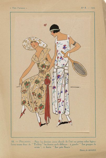 Curator: Ah, the vibrancy of Art Nouveau distilled in a print. What strikes you first about this image? Editor: The flatness, the utter lack of perspective. It’s almost comical how deliberately two-dimensional the figures are. Though the title, printed directly onto the work itself, "Très Parisien," certainly gives it context. Curator: Indeed. We're looking at "Très Parisien, 1923, No 7: 17.- JOURS DE CHALEUR. - 1. Robe de voile de coton...", a print currently housed in the Rijksmuseum, if I recall correctly. The piece encapsulates a pivotal moment in decorative art. Note the stylized figures and the meticulous rendering of the clothing. Editor: They appear less like portraits and more like models showcasing garments; It resembles a fashion plate from that era. The women lack individualized features, which enhances the image's function as a design showcase. The contrast between the green dress patterned with dark flora and the straight white one lined in a cotton-candy pink feels deliberately harmonious despite being diametrically opposing aesthetics. Curator: Precisely. The artist has rendered the scene as if these textiles carry inherent significance, their patterns, trims, and materials serving as symbolic expressions themselves. Observe how negative space carves out detail and how outlines are reduced only where colour creates definition; it speaks to the semiotic intent of its design. Editor: That makes sense. In 1923, the Roaring Twenties were well underway, and consumer culture and artistic production became inextricably linked. This piece, with its attention to textiles and fashion, underscores how art both reflected and propelled societal shifts during this time. Curator: Exactly! Its emphasis on contemporary Parisian fashion mirrors the increased consumerism and commodification of art at that moment. It’s far more than just a depiction of dresses; it's a commentary on modern urban life. Editor: Well, from a historical vantage, seeing the object within that framework deepens the experience. Thank you for helping bring such depth into focus here today! Curator: And thank you for broadening its context—seeing beyond mere composition to comprehend the art as a sociocultural record enhances the dialogue itself!