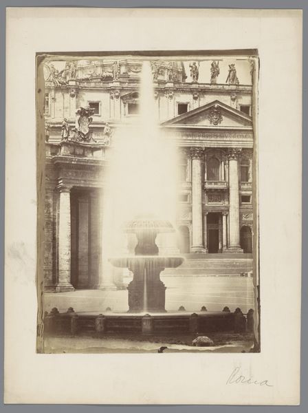 Curator: Standing before us is William Henry Fox Talbot's "Carclew House," captured in 1841 using the daguerreotype process. Editor: The silvery tones give it a strangely ethereal feel. It's not a crisp image, more of a hazy dream of a stately home. The weight of those neoclassical columns really comes through though. Curator: Indeed. Talbot, a pioneer of photography, made this image as part of his effort to document country estates, part of a Romantic-era fascination with rural gentry. It tells us a great deal about 19th-century British society and its obsession with social class. Editor: The composition really emphasizes that hierarchical perspective, doesn’t it? Look how the figures on the ground almost fade away, while those on the balcony seem to observe them from a raised, untouchable plane. Curator: Precisely. Talbot's selection of the subject matter and his framing invites the viewer to observe the social strata embodied by the architecture and inhabitants of Carclew. Editor: And that textural richness! The way the light dances across the stonework, each pillar a subtly different shade, there is depth there despite the apparent flatness. What is really interesting to me, in particular, is the angle that captures the classical composition of pillars and balcony as it converges with people milling about as the photo fades at the bottom. The texture contrasts against what looks like pure shapes, geometric patterns on stone. Curator: What seems like fading at the bottom of the photograph is attributable to the nature of the medium, as early photographic processes were often subject to such imperfections, artifacts really. It reminds us of the limits of technological ability at the time and allows a peek into the challenges of representing reality faithfully. Editor: So the limitations paradoxically contribute to the meaning! A compelling insight. Curator: Yes, the picture opens up conversations regarding power dynamics in that era. We begin to question the social roles each class must conform to while asking questions about their identities, something we wouldn’t typically gather without a lens to the photograph and Talbot’s genius. Editor: "Carclew House" makes us consider not only the image but also what’s left out of it, doesn’t it? Thank you for unveiling some more meaning for me today.