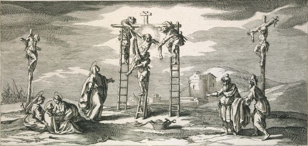 Andrea Mantegna created this engraving, "The Descent from the Cross," around the late 15th century. The dramatic scene is rendered through dense, cross-hatched lines that model the figures and rocky landscape with striking clarity. Mantegna uses stark contrasts of light and shadow to amplify the emotional weight of the moment. Notice how the composition centers around the stark verticality of the cross and ladders, offset by the limp, diagonal form of Christ's body. The lines of the cross and ladder create a structural framework around which the figures are arranged. This geometric underpinning, while rigid, enhances the human drama unfolding. The artist masterfully uses the engraving technique to create depth and texture. The dense lines not only describe form but also evoke a sense of grief and solemnity appropriate to the scene. Mantegna's formal choices reflect a broader cultural engagement with humanism, bringing a new level of emotional and physical realism to religious subjects.