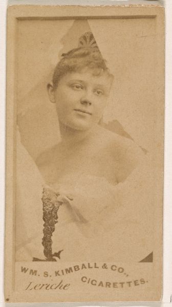 Curator: Let's talk about "Mlle. Tissot," a trade card from the 1880s, part of the Actors and Actresses series issued by W. Duke, Sons & Co. to promote Duke Cigarettes. It’s currently held at the Metropolitan Museum of Art. Editor: My immediate impression is one of subtle tension. The soft focus gives a romantic feel, but the direct gaze and the commercial inscription beneath...it's an odd mix. Curator: Precisely! It’s fascinating how this small print functioned. Tobacco companies utilized such images as marketing tools; inexpensive yet circulated widely. This card stock itself— what does its fragility say about the transient nature of celebrity and consumer desire? Editor: And what about the actress herself? Mlle. Tissot. Her name promises something exotic, perhaps a connection to the painter James Tissot, known for his depictions of fashionable women. Was it intentional to connect her with the aspirational lifestyle associated with the leisure classes through name alone? Curator: It highlights the blurred lines between entertainment, aspiration, and consumption in the late 19th century. Notice how her presentation –the simple dress, cropped hair, confident stare– contributes to that. Editor: The framing, her pose…they evoke a sense of intimacy but also commodification. I wonder about her personal narrative versus what the company projected onto her. Tobacco advertising employed the idea of glamour. Was she complicit, unaware, or both? Curator: An excellent point. The image, beyond its pictorial representation, actively participated in the construction of both her persona and Duke Cigarettes' brand image, making the company itself complicit, of course. Her face is essentially raw material used for profit. Editor: Exactly. This unassuming portrait of Mlle. Tissot reminds us how images of public figures are deeply connected to societal shifts and economics, with psychological intent beyond the immediate sale of tobacco. It leaves me thinking of the hidden stories behind seemingly innocuous ephemera. Curator: Yes, examining this print reminds us that it’s more than just marketing; it reflects how labor, celebrity and consumerism converged in this particular historical context. Editor: Absolutely, this small token contains entire worlds worth examining.