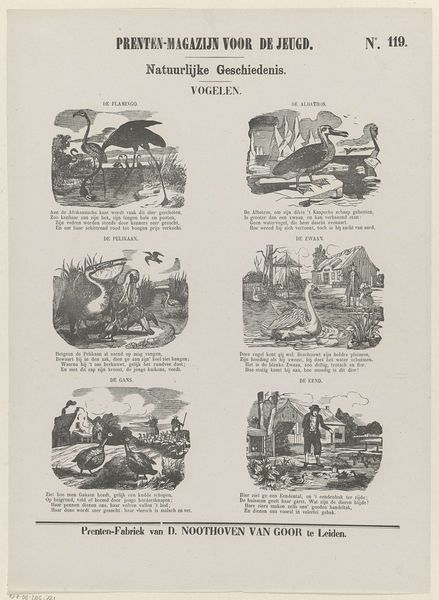 This print titled 'Vogelen' or 'Birds' in English, was created by D. Noothoven van Goor in Leiden. It provides a glimpse into how Europeans understood and depicted the natural world during a time of increased colonial expansion. The series of vignettes illustrates various bird species, each accompanied by descriptive text. What's striking is not just the attempt to categorize and document these birds, but also the implied power dynamic, in which the European gaze defines and frames the narrative around these creatures from distant lands. Consider the emotional distance inherent in viewing these animals as specimens, divorced from their ecological and cultural contexts. There's a certain coldness in this scientific observation, a detachment that reflects the broader colonial project of extraction and control. Are these depictions respectful, or do they reduce living beings to mere objects of study and possession? 'Vogelen' presents a window into a past where the pursuit of knowledge was intertwined with the assertion of dominance, prompting us to reflect on the ethics of representation and the legacy of colonialism in shaping our understanding of the world.