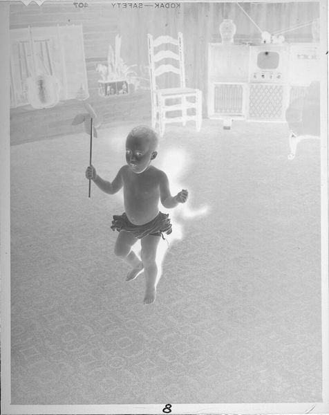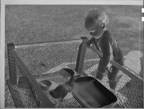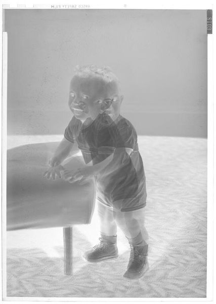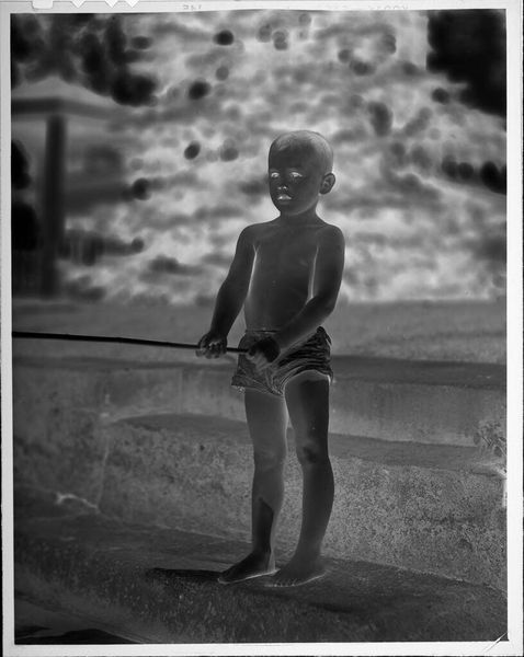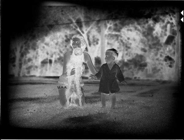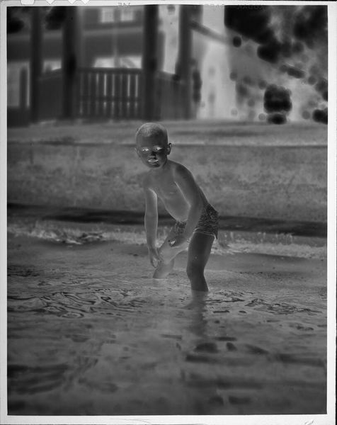 Curator: This gelatin silver print by Lucian and Mary Brown captures a child playing in a sprinkler. The artwork is currently held in the Harvard Art Museums. Editor: It feels both innocent and a bit melancholy, doesn't it? The stark contrast almost gives it a dreamlike quality, like a memory fading at the edges. Curator: Exactly. The high contrast emphasizes a certain social realism, a slice of mid-century American life centered around family and leisure, yet stripped of sentimental color. Editor: I wonder about the child. Is it their child, maybe? There's something about the pose, almost tentative, as if the world is a vast, slightly intimidating playground. Curator: It could well be. The Browns were very involved in documenting daily life, capturing both the mundane and the profound. This image speaks to that blend. The sprinkler itself becomes almost monumental in its simplicity. Editor: Yes, almost sculptural. It really gives you pause to consider fleeting moments of joy and how photography can hold them still for us. Curator: Indeed. It reminds us that art often finds beauty in the ephemeral and the everyday.