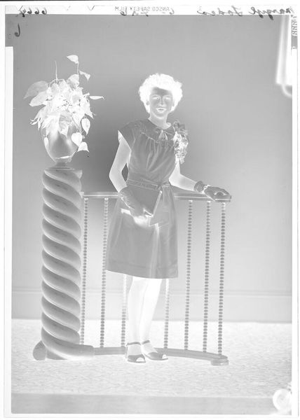 Curator: This is an untitled studio portrait by John Deusing, currently held in the Harvard Art Museums. Editor: It’s a fascinatingly staged photograph, evoking a mood of both hopeful anticipation and a certain guardedness. Curator: Yes, that guardedness might stem from the symbolism of the curved gate she stands behind, a threshold perhaps, but also a barrier. Her corsage and hat suggest a special occasion. Editor: The materiality of the backdrop also interests me. The contrast between the soft fabric drape and the hard, manufactured gate speaks to social constructions of femininity in the mid-20th century. Curator: The gate could also represent a rite of passage, that moment of stepping into adulthood, burdened by cultural expectations. The hat and corsage are almost like ritual adornments. Editor: Right, mass-produced symbols of aspiration. The photograph itself as a commodity, documenting and reinforcing social status. Curator: The pose, the gate, the corsage – all contribute to a visual language that’s both personal and deeply embedded in cultural norms. Editor: Exactly, which makes me wonder about the labor involved in creating this image. The photographer, the set builders... Curator: It gives us so much to think about! Editor: Indeed, a potent image.