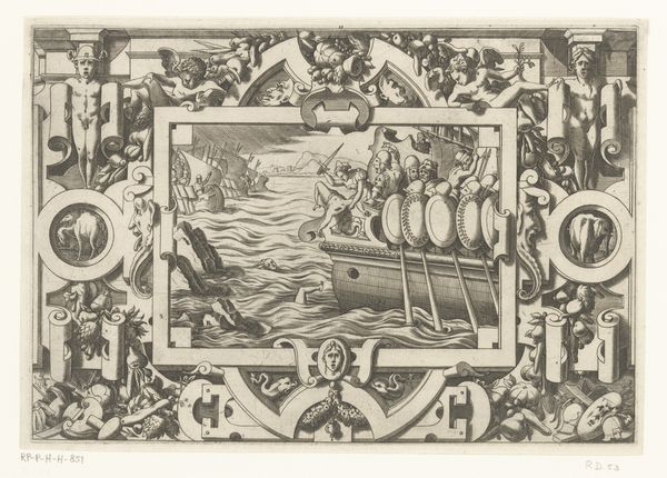 Curator: We're looking at "Vignet met een belegering van een schip en het wapen van de stad Haarlem," an anonymous 17th-century print. Editor: The woodcut style is striking. It evokes such a particular era of production, you know? The bold lines create a rather powerful scene, don’t you think? Curator: Indeed. The composition adheres to a rather conventional understanding of symbolic representation. A ship dominates the scene, flanked by towers, and topped by a crest containing heraldic symbolism – the sword and stars emblematic of Haarlem. The detail is remarkable. Editor: Yes, remarkable for its medium, certainly. The labor involved in carving that level of detail into wood is intense! The texture visible on the water and within the ornamental borders show the process quite viscerally; you can practically feel the resistance of the wood against the cutting tool. Curator: Note also how the artist deploys line to construct the depth of field. Consider the subtle variations in the rendering of the water and the receding coastline, constructed entirely through line. Editor: I also think it's vital we think about this piece's function as part of material culture; "Schouts Dienaers" inscribed suggests that the print was possibly tied to the constabulary. We can imagine multiples of it produced relatively easily and disseminated, which says something about civic structure. Curator: That may well be. The integration of text certainly alludes to communicative intention. And how those letterforms mirror, even amplify, the linearity of the illustration itself. Editor: Absolutely! Seeing how things were circulated, the very physicality of printed information itself– that is crucial! Curator: A beautiful demonstration of symbolic economy, condensed within the confines of a limited frame. Editor: Indeed. It leaves me contemplating labor and craft! Curator: It is indeed quite aesthetically rigorous for such an unassuming object.