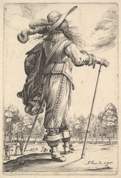 This is an impression of an etching, likely made in the 17th century, depicting a blind man and his dog, part of a series known as "The Beggars." Though the artist remains unknown, the work invites us to consider the lives of the marginalized in early modern Europe. Note the figure's tattered, yet strangely elegant clothing—a fur-lined coat and wide-brimmed hat. The sword at his side hints at a former status, now lost. This juxtaposition speaks volumes about the precarity of social identity during a time of immense economic and social change. The print doesn't shy away from showing the realities of poverty and disability, offering a glimpse into a world often ignored by the wealthy. What does it mean to be seen, or unseen, in a society that often equates worth with visibility? This image isn't just a historical document, it's an invitation to reflect on who we choose to see, and who we choose to ignore, in our own time.