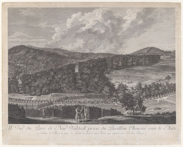 Curator: Here we have "IIIe Vue du Parc de Neu-Waldeck prise du Pavillon Chinois vers le Couchant," a 1782 etching by Jakob Matthias Schmutzer, currently residing at the Metropolitan Museum. Editor: Oh, a classical garden dream! It’s all neatly ordered and a bit…melancholy. Even with the little figures down front, it feels strangely deserted. Curator: Yes, these landscapes often functioned as symbols of control, both over nature and society. The precisely laid out gardens, the distant, manicured woods… Editor: It’s interesting you say “control,” because it also strikes me as yearning. Longing for an idealized past. Like someone built their memories, rather than a functional park. Curator: You are perceptive. Neoclassicism always looks back, drawing on antique forms to establish a visual and ideological authority. Consider the implications of staging these historical “views”. Editor: The vanishing point way off in the distance, those lines are powerful, leading the eye—and thought. Even this etching itself becomes a symbol, reproducing and thus reinforcing a certain way of seeing. Curator: Precisely! And that so-called Chinese Pavilion—merely suggested—a fashionable exoticism deployed for visual effect, fitting within the overarching framework of order. Editor: Exoticism reduced to stage dressing! And these miniature people standing stiffly, almost like game pieces… their world is curated just like the scene before them. I get a definite sense of performance. Curator: Indeed. What appears natural is carefully constructed. It’s history-painting, but using landscape itself to convey a political and social message. Even these etchings play a role in projecting power, shaping an aristocratic "gaze". Editor: Funny, that a calm park view can have so many complicated shadows. Seeing this I am both calmed and deeply unsettled. Curator: A productive tension, wouldn't you say? Art holding a mirror to human intentions. Editor: Absolutely. Leaving me wondering who builds these paradises… and for whom.