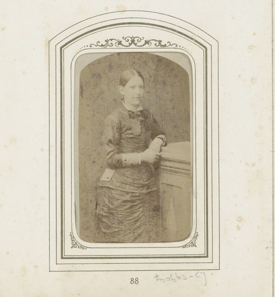 Editor: Here we have Eugène Guérin’s photograph, “Portret van een meisje, staand bij een sokkel met bloemen,” placing it sometime between 1875 and 1885. The young girl poses rigidly, a floral arrangement perched precariously on the column beside her. The sepia tone and formal composition give the portrait a stilted, almost haunting feel. What do you see in this piece? Curator: Immediately, I’m drawn to the contrasting textures and lines within the photographic frame. Consider the rigid verticality of the column juxtaposed with the cascading floral arrangement, echoed in the girl’s patterned skirt. And what of the wall paper design versus the stark, relatively pattern free jacket? We find an internal tension between decoration and restraint, creating an interesting dichotomy within the formal structure. Editor: I see that! So the tension in the arrangement of shapes and textures mirrors perhaps societal constraints placed upon the subject. Curator: Precisely. Notice also the way the photographer used light and shadow to model her face and draw attention to her youth. Though muted and fairly consistent, light clearly pours in from camera right, allowing the girl’s white coat to glow in comparison to her shadowed and relatively indiscernible face. Consider how such careful composition and manipulation of light draw attention to certain formal relationships over the face or eyes we expect in a portrait. Editor: It's fascinating how much can be gleaned by focusing on these intrinsic formal elements. I didn't notice these qualities until now! Curator: These careful choices and tensions, once observed, invite deeper speculation. Considering how one might further apply semiotic understanding or structural reading could, potentially, add further to such nuanced interpretation. Editor: This formalist perspective has provided an insightful method of viewing. It provides such an enhanced, concentrated and critical point of view. Curator: Agreed, every artwork is simply layers upon layers.