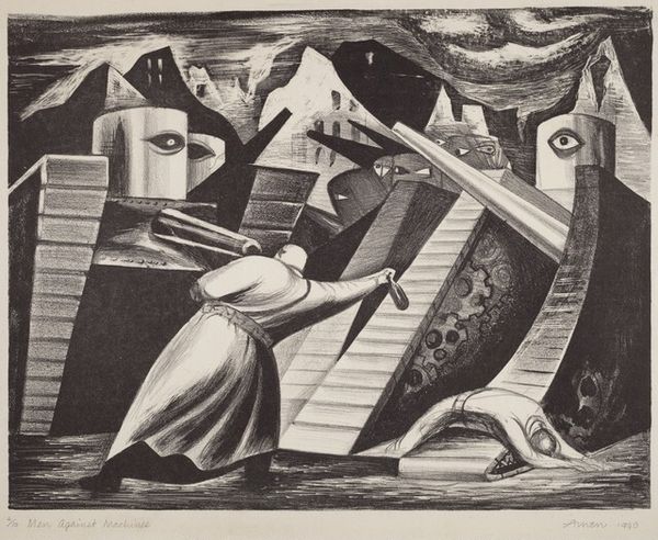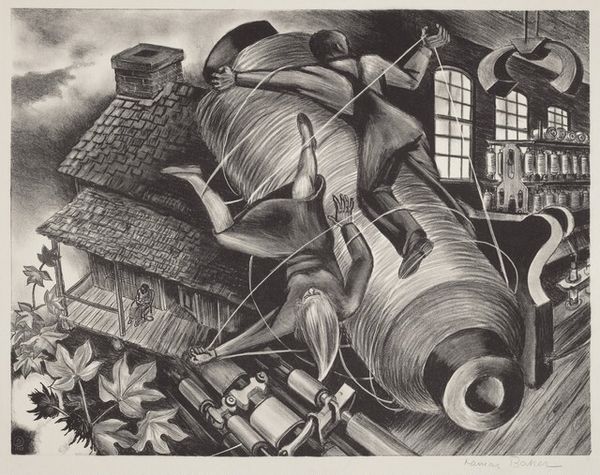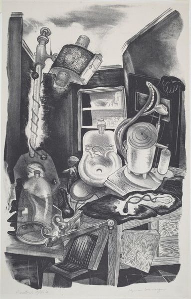 Curator: This is "The Forge," a pencil drawing and print created by Wanda Gág in 1932. Editor: It's got this really dense, almost claustrophobic feeling to it. All those tools crammed together...makes me think of cluttered workshops from my childhood. Dusty, metallic, a bit… menacing, almost. Curator: Indeed. The image speaks to broader debates regarding industrial labor, specifically the romanticized portrayal of the pre-industrial trades juxtaposed against the growing mechanization during the early 20th century. Gág's focus on a space filled with hand tools asks us to reflect on the changing nature of work. Editor: Absolutely, you can practically smell the wood shavings and the sweat! But there’s something about how she’s arranged everything; the light from the window… it’s more than just a snapshot. It almost feels staged, like a little theater set of a dying craft. Curator: That staging invites a powerful critique of capitalism, doesn’t it? Highlighting the value, yet simultaneously signaling the marginalization, of manual skills. Her work often delved into similar social critiques through explorations of personal space. Editor: Exactly! And the pencil work... that tight hatching gives everything this tangible weight, but it's also dreamlike. It reminds me that we see nostalgia itself through a crafted lens. I like how the drawing material reinforces the subject of hand-made quality. Curator: Yes. Gág, a woman artist portraying labor, introduces an interesting layer considering the gendered expectations tied to domestic space and professional spheres during the period. How does a woman’s gaze reframe the narrative? Editor: Good point! Maybe that’s part of why it feels a bit off-kilter. It's like she’s turning the traditionally masculine world of the forge into a still life, making it quieter, more contemplative. Makes me question the whole "strong man" narrative linked with this craft. Curator: Examining those kinds of assumptions, those gendered power dynamics that structure labor and art itself, becomes very important in viewing "The Forge." Thank you, as always, for these thoughtful personal connections, lending contemporary meaning. Editor: Of course! It’s one thing to study art, but another to really feel its textures against our own lives. Always good to connect the personal and the historical and let the drawing lead you somewhere new!