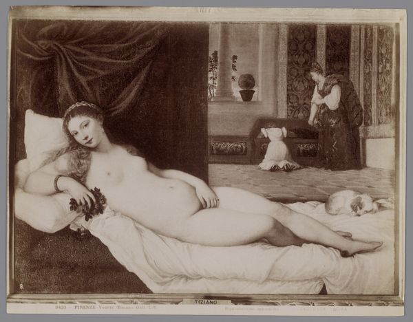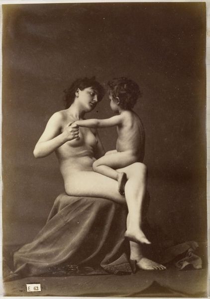Editor: This is Gustave Le Gray's "Nu féminin allongé sur un canapé Récamier," a gelatin silver print made between 1854 and 1858. It's a very composed nude photograph that seems to hark back to classical painting. How do you interpret this work in its historical context? Curator: This image is rife with contradictions and tensions related to gender, class, and the emerging medium of photography itself. On one hand, we see a female nude, recalling the academic tradition and male gaze prevalent in art history. But, by using photography, Le Gray also engages with ideas of realism and the potential to democratize representation. Editor: I see what you mean. It's interesting that he chooses photography for this subject matter. Curator: Precisely. In the mid-19th century, the naked body was charged with all sorts of societal expectations. The photograph could subvert the power of the artist’s hand but not its inherent point of view. Is it objectification, or an attempt at an authentic representation? Who was this woman and what were the circumstances? These are the kind of important intersectional questions we need to ask of this historical photograph, and what responsibility do we have to her today. Editor: Those are some important things to keep in mind. I never considered the perspective of the subject in historical nudes. Curator: It's essential. What about the staging of this picture, with the woman draped on that canapé and softly lit, what feeling does it evoke in you? Editor: There is something unsettling about the dark background, the composition feels posed, the intent hidden. This all encourages us to unpack the ideas inherent in photography and painting and think about art production on a much deeper level. Thanks for pointing all this out! Curator: It is exactly this kind of close looking and questioning that makes historical works resonate today.