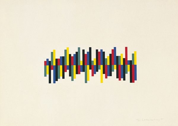 Curator: Looking at this intriguing drawing, "Composition" from 1965, created by Verena Loewensberg, what’s your immediate take? Editor: The drawing feels clean and very direct. The lines, the colour, the geometry. A very refreshing feeling! Curator: Well, Loewensberg, closely involved with the Zurich Concrete movement, was interested in removing all traces of expression to highlight the materiality of color and line. This approach moved away from subjective artistic expression and invited others to engage more with the pure aesthetic experience of color and line on the surface. The choice to use colored pencils too brings attention to the process, right? It’s humble and familiar. Editor: Absolutely. Notice how the rectangular segments interplay, each meeting another; this is an orchestrated geometry that lends itself to close visual examination of the composition. And yes, the materiality is also there, if muted. But what I think stands out is how that intersection of color gives us so much. Loewensberg masterfully creates a sense of depth and layering, that belies the flat medium. Curator: Indeed. And considering the historical context, just after World War II, art began moving toward embracing such geometric abstraction, it mirrored a desire for order and rebuilding, where pure shapes could express the idea of rationality over the chaos and uncertainty brought by social upheaval. And coloured pencils made it accessible! Editor: From a purely structural perspective, observe how the placement of vertical and horizontal rectangles leads our eye across the picture plane, giving the drawing motion despite its rigidity. The limited but deliberate palette invites us to discern not just their difference but what they might have in common and where the eye finds rest. Curator: It shows how Loewensberg aimed to show relationships— between color, between shape, between order and variation through this arrangement. It is meant to bring you back to a certain materiality, by stripping everything down. Editor: It brings it full circle, doesn’t it? From surface to symbol and back to material awareness. A quietly powerful statement with subtle means. Curator: Exactly. I believe this particular “Composition” continues to demonstrate the complex role that the language of geometric form can play in how we perceive postwar rebuilding, the process behind art and everyday objects, and of course, visual perception.
