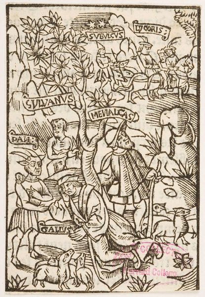 Editor: This is Illustration XI, by an anonymous artist, at the Harvard Art Museums. The figures are fascinating, with their archaic dress and musical instruments. What cultural stories do you think it tells? Curator: Note the text "Satir" and "Silvanus." Consider the satyr, a symbol of untamed nature and revelry, juxtaposed with Silvanus, the Roman deity of the woods. What happens when these primal energies meet civilized society? Editor: So, it's about the tension between nature and culture? Curator: Precisely. The image evokes the symbolism of human transformation, as satyrs test boundaries. It also prompts us to consider who is in control and if this dichotomy still exists today. Editor: Interesting; it's a dialogue between nature and humanity. I see that in a completely different way now. Curator: Symbolism can enrich our understanding of even the simplest illustration, adding layers of interpretation beyond the immediate image.