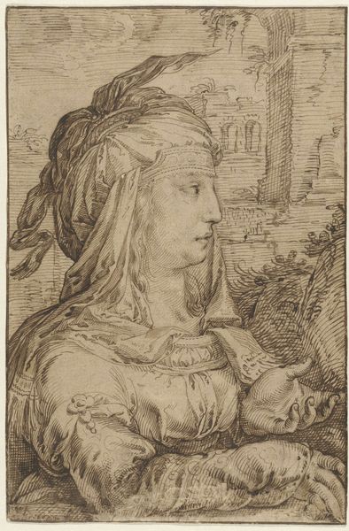 Jan Cornelisz Vermeyen created this print, "Girl with a Cat," using engraving, a process that demands precision and control. The image begins with a metal plate, likely copper, into which the artist meticulously carves lines. Ink is then pressed into these grooves, and the surface is wiped clean, allowing the design to be transferred to paper under immense pressure. The stark contrast between the lines and the blank paper creates a striking image, a testament to the engraver’s skill. Each line is carefully placed to define form and texture, from the soft fur of the cat to the delicate folds of the girl's headdress. This process, rooted in the tradition of printmaking, allowed for the reproduction and distribution of images, influencing the way art and information circulated during the Renaissance. Consider how the act of engraving, with its directness and replicability, democratized art, bringing images to a wider audience beyond the elite circles of painting and sculpture. This piece exemplifies how close attention to materials and making can offer profound insights into the cultural and social contexts of the time.