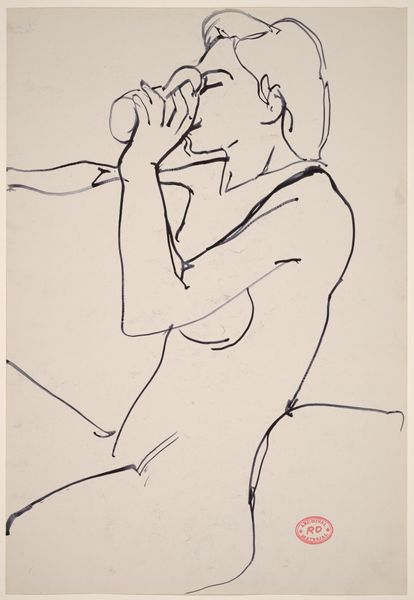 Curator: This ink drawing, simply titled "Untitled [seated female nude resting in an armchair]," was created by Richard Diebenkorn sometime between 1955 and 1967. What are your initial thoughts? Editor: There’s an air of vulnerability, wouldn’t you say? That exposed skin combined with her withdrawn posture... it evokes introspection and perhaps even a touch of melancholy. The simplified form speaks to the essentials of human experience. Curator: I agree. Consider that Diebenkorn created this during a time of intense social upheaval and shifting gender roles. The lone female figure, rendered so directly, speaks volumes about the experience of women navigating changing social landscapes. We see her, almost raw, beyond social constructions. Editor: Indeed. The arm supporting her face acts as a shield, doesn't it? The lines, while minimal, highlight specific parts of the body – her shoulder, her breasts, a leg… I perceive in them both, the burden of self-consciousness, but also the beauty of the simple human form outside the ideal of classical perfection. Curator: Right. It’s a potent image. The open lines challenge conventional beauty standards, highlighting the realities of the human form with unembellished honesty. It's as if Diebenkorn asks us to confront our preconceived notions of beauty and femininity. The lack of a clear setting further isolates the figure, emphasizing her inner state. Editor: The posture suggests thoughtfulness. To me, she is more than a physical nude figure: she becomes the timeless image of internal meditation on feminine identity, the very notion of self in a rapidly evolving world, with all its complexities, contradictions and self-scrutiny. Curator: Precisely. Viewing Diebenkorn’s work through a contemporary lens offers opportunities for rich dialogues surrounding representation, identity, and the enduring quest for self-understanding. Editor: It is definitely a visual symbol of this introspection—perhaps one that each generation can understand through the nuances of their time. Thank you for guiding me through this work. Curator: It was my pleasure to shed a bit of context on Diebenkorn’s drawing with you!
