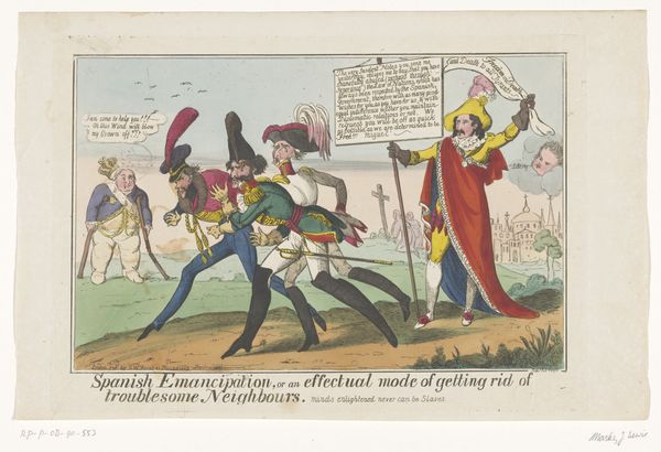 Curator: Charles Williams’ etching, dating to around 1818, is entitled "Skating- Dandies, Shewing Off". It is part of the collection here at The Art Institute of Chicago. Editor: Chaos! Absolute chaos on ice. It's funny how Williams renders their failed attempts at fashionable skating. All stiff limbs and flailing bodies! The sheer number of figures makes it quite engaging. Curator: I agree! It's not just humorous but functions as social critique. Williams mocks the superficiality of the dandies and comments on the shifting class dynamics during the Regency period. These men, so desperate to prove themselves, fall quite literally on their faces, so to speak. The act of performance reveals anxieties surrounding masculinity and status. Editor: I'm intrigued by the use of etching as the primary medium. It feels appropriate for capturing such satirical subject matter with precision and detail. Consider how the subtle cross-hatching defines form while lending texture to both their clothing and the ice. You almost feel the chill. Do you think paper was essential to democratizing the artform and broadening distribution beyond the aristocratic sphere? Curator: Absolutely, printmaking and etching are intertwined with social critique, providing wider distribution and potentially subversive commentary in accessible and affordable ways. Paper allows for wider consumption, disrupting elite control over cultural narratives. This challenges societal hierarchies, as the image could find its way into different social classes through mass production. Editor: It's striking how clothing functions as both the symbol of their aspiration and their undoing, isn't it? Constricting shapes lead to clumsy attempts, underscoring the disparity between idealized presentation and ungraceful reality. They're literally tripping over their own sartorial aspirations. Curator: The exaggerated silhouettes and absurd poses certainly amplify the satirical bite. It is in direct dialogue with broader questions surrounding identity, particularly anxieties related to class mobility. Through careful material and thematic consideration, we glean richer insights on gender roles. Editor: By examining materiality, and labor in this era of production, these romantic images become political. So then, our conversation is as valuable to understanding as Charles Williams was back in 1818, revealing, bit by bit, the nature of the beast, even two centuries later. Curator: Indeed. Thank you for illuminating those production and social elements; it adds depth to appreciating how prints such as "Skating-Dandies" shape narratives.