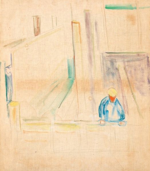 Editor: We're looking at "Four Girls in Åsgårdstrand," a watercolor by Edvard Munch from 1922. It's ethereal and ghostly – feels like a memory half-faded. I'm struck by the incompleteness of it, the raw sketchiness. What do you see here, in this watery echo of a scene? Curator: It feels like stumbling upon a dream, doesn’t it? The translucent layers of watercolor certainly lend themselves to that sense of fleeting beauty, a captured moment on the cusp of disappearing. Munch, you know, he often revisited themes throughout his career; locations, figures...almost haunted by them. Åsgårdstrand was particularly meaningful; it was where he spent many summers, a place of both joy and turmoil for him. This image—does it strike you as finished, unfinished, or perhaps intentionally somewhere in-between? Editor: Somewhere in-between, definitely! It’s like he wanted to show the process, not just the outcome. There's the setting so delicately sketched at the far left with green ink that bleeds together almost mimicking plantlife, but in contrast the figure is at once recognizable and ghostly. You said joy and turmoil – how might both be present here? Curator: Exactly! Look at the girls – there's an innocence, a fragility in those light washes of color. But the almost feverish application of color near the foreground contrasts sharply with the cool serenity of the garden; there's a sense of unease just bubbling under the surface. And water colors in general give me a very unique impression because Munch also conveys the transience of childhood. It’s as though he's grappling with time itself, and how memories change with each passing year. Do you notice that sort of dialogue too, between the serenity of a summer day and the subtle undercurrent of melancholy? Editor: I do now! That melancholy adds so much depth. It's more than just a pretty scene, it’s… a meditation on time and memory. Curator: Precisely. It seems that even with its simplicity, or perhaps because of it, Munch offers us a window into the complex and often contradictory nature of remembering.