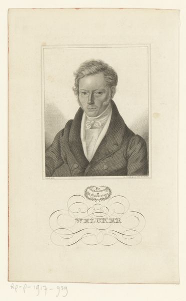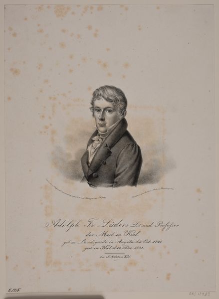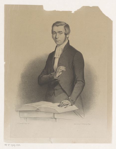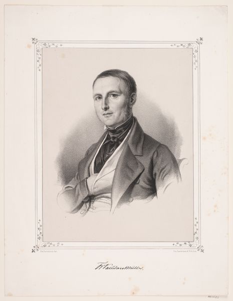 Curator: This is a portrait of the oboist Henri Brod, dating from around 1835, made by Antoine Catherine Adolphe Fonrouge. It's a lithograph, so a print made from a drawing, likely in pencil originally. Editor: You know, what strikes me first is how… earnest he looks. Very buttoned-up, literally and figuratively. But there’s also a hint of a smirk. Like he knows something we don’t, perhaps the secret to hitting those high notes on the oboe! Curator: Well, the Romantic era valued expressiveness, but also a sense of decorum. This portrait probably reflects the public image Brod wanted to cultivate as a respectable musician and composer. Notice the detailed rendering of his clothing and the crispness of the line, aiming for realistic likeness. Editor: Absolutely. And the hatching gives him real presence, lifting him off the page. But the soft focus around the edges feels like it belongs to the world of dreams, adding to the sense of the sublime, just a touch. I wonder, was he happy with it, do you think? As a musician, your image is your currency in a way, isn’t it? Curator: The success of a portrait like this depended on many factors: the sitter's social standing, the artist's reputation, and, of course, the prevailing aesthetic tastes. Printmaking also democratized portraiture. Previously, only the wealthy could afford painted portraits, but now, a wider audience could access images of prominent figures like Brod. Editor: A kind of Instagram for the 19th century! It makes me think about the curated image and what it is hiding. And who gets to control that narrative? He has the ‘look of a composer’ but he also looks constrained and proper – one has to ask was it for effect or by force? It’s hard to say for sure, the image is more complicated, for me, the more I look at it. Curator: It also highlights the rise of the virtuoso musician as a cultural celebrity. Composers were elevated and the art celebrated; and as music shifted from the private salon to the public concert hall, musicians like Henri Brod acquired fame and influence that made their image marketable and their opinion powerful. Editor: Exactly, art creates a buzz around you – so, I suppose, that maybe he wouldn’t play his oboe in just *any* saloon, that there might be an audience there worthy of such performance. Anyway, it's fascinating how much social history is baked into a simple lithograph. Curator: Indeed, what appears to be just a likeness reveals a much larger story. The complex world of music appreciation and consumption within 19th-century Europe. Editor: And the eternal question of art, isn’t it, “Who am I in the face of the art, the market and the establishment?" Anyway, now when I listen to the oboe, I will definitely think of Brod, wrestling with that very question, buttoned up against the world!