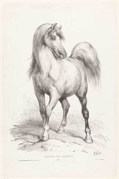 Curator: Standing before us is "Hesten Velskabt," or "Well-Shaped Horse," created by Christian David Gebauer in 1822. This lovely lithograph, a blend of drawing and printmaking, resides here at the SMK, Statens Museum for Kunst. What strikes you first? Editor: Well, apart from the obvious elegance of the beast, the framing… it feels stagey, like the horse is posing against a very minimal backdrop, as if in a studio. Very deliberate and considered in its portrayal of form and musculature. Curator: Exactly! It's not just a horse; it's an ideal. Gebauer captures this Romantic fascination with nature, elevated and somewhat abstracted. It is an equestrian portrait of, probably, a beloved horse; a status symbol depicted as noble. I am so curious if the actual animal possessed these godlike attributes! Editor: The color choices certainly aid this sense of Romantic grandeur, yes. The deep brown coat against that misty landscape palette contributes to the animal’s statuesque quality and formal perfection, don't you agree? He strikes an elegant pose on what resembles a theatre stage. It's a very structured, almost diagrammatic approach. And you could say it is Gebauer’s own emotional projection upon a figure within an external, idealised landscape. Curator: Ah, "diagrammatic" is an insightful way to put it! And there’s a sensitivity in the subtle gradations of the watercolour, lending it a very evocative tone, despite the apparent precision of form. This artwork speaks to how one seeks to perceive that which makes us happy in reality. Is this reality, or our own vision? The lithograph seems to straddle both beautifully. Editor: The piece highlights the ongoing dialogue between the ideal and the real— between constructed form and felt experience. This tension, it seems, keeps it visually alive even after two centuries. A beautiful horse portrait! Curator: Precisely. A lasting depiction that urges us to ponder on art and how it acts as an intimate window to another’s perception, no matter how old. Thanks for offering such acute perspective on this gem, too!