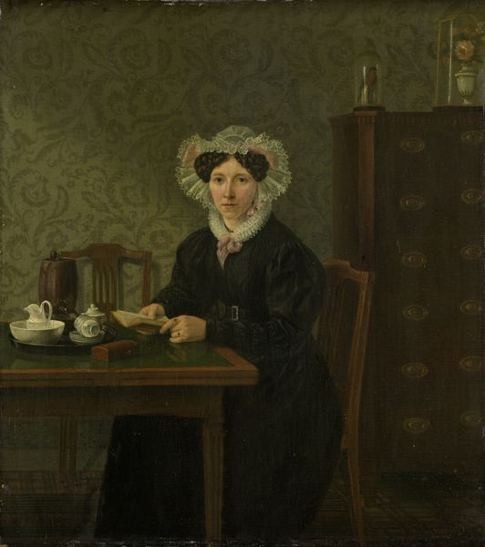 Editor: Here we have "Dutch Girl at Breakfast," an oil painting from around 1756 by Jean-Étienne Liotard. There’s such an intimate feel to this genre painting of a young woman. The composition and subdued lighting add a layer of tranquility, as though we’re catching her in a very private moment. What stands out to you? Curator: It’s interesting to consider this in the context of 18th-century European society. These genre scenes were popular amongst the emerging middle class. The detail afforded to the interior—the clothing and domestic setting—suggest a certain level of affluence. This image functions, in a way, as aspirational; a way to display domestic virtue and bourgeois respectability. Editor: I see what you mean about respectability. Her simple dress and actions could signify modesty. Would you say the painting enforces certain expectations for women of the time? Curator: Absolutely. Paintings like these reinforced social norms, offering moral instruction through visual representation. This quiet, domestic scene implies an ideal for feminine behavior. What do you make of her averted gaze and her position near the center of the picture? Editor: Her gaze does add a sense of mystery and introspective feeling to it. It invites contemplation from us. Considering that portraits often represented wealthy elites and rulers, it makes me wonder about the public perception of everyday life then. How novel was it? Curator: Good question! The popularity of genre paintings signalled a shift towards appreciating, or perhaps idealising, the everyday lives of ordinary people. They played a significant role in shaping public opinion and influencing social behaviors. The Dutch Girl epitomises the burgeoning importance of private life during the rise of bourgeois culture. Editor: That's so interesting! Now I view it less as just a peaceful picture and more as an insight into 18th-century values. Curator: Indeed, art often holds a mirror to society, reflecting our aspirations, expectations, and even our subtle biases.