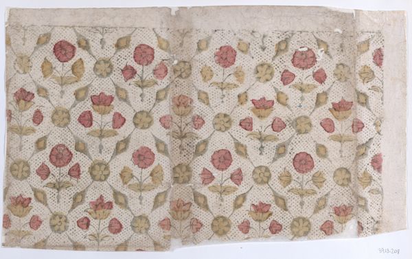 Editor: This is a “Sheet with overall floral and dot pattern,” an anonymous textile design dating from 1800 to 1900. It strikes me as quite delicate, with its repetitive motif and muted colors. What elements stand out to you when you look at it? Curator: Primarily, I observe the interplay between the floral motifs and the dotted ground. Note how the repetition isn't exact; there's a subtle variation in the rendering of each flower and leaf. This imbues the design with a handmade quality, despite its seemingly systematic organization. Do you see how the dots create an underlying grid, a structure upon which the floral elements are then layered? Editor: Yes, I see that now. The dots do provide a kind of order. But how would you interpret the combination of these elements? Curator: Consider the composition. The regularity of the grid contrasts beautifully with the organic forms of the flowers. This creates a tension – a visual push and pull between order and nature. The success of the design relies precisely on this equilibrium. Also, reflect upon the colors employed. The muted palette, comprising reddish flowers and subdued greenery, flattens the depth. This further emphasizes the flatness and objecthood, inviting us to read the design first, and any illusion of naturalism after that. Editor: That's a fascinating way to think about it. I hadn't considered the flatness as a deliberate choice contributing to the overall design. Curator: Exactly. The formal elements are always in conversation. Thinking through how elements speak to each other opens new possibilities of appreciating the choices of the artist. It changes how we encounter design or even art in general. Editor: Thank you, seeing how those elements combine and enhance one another has certainly opened my eyes to a new appreciation.