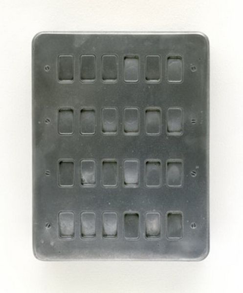Curator: Let's turn our attention to Grazia Varisco's "Mercuriale" from 1967, a compelling piece rendered in metal. Varisco, associated with kinetic and conceptual art, presents us with an artwork that operates almost like a systematic study of form and light. Editor: It has a mesmerizing, almost hypnotic quality, doesn’t it? The reflections on the metal surfaces, combined with the grid structure, create this interplay between order and the subtly chaotic, like you could stare at it for ages. Curator: Precisely. Varisco’s interest lies in seriality, where repetition and subtle variation become the core visual language. "Mercuriale" reflects the socio-political context in Italy where artists reacted against traditional art norms and the pervasive socio-economic climate, emphasizing industrial materials and methods. Editor: Seeing it like that makes the repeated, almost modular, metallic forms evoke factories, workers, maybe even the commodification of labor that was such a charged issue back then. Are the irregularities within that regimented structure Varisco’s subtle rebellion? Curator: The slightly imperfect nature of these individual forms breaks the potential monotony, injecting dynamism and life into the structure. Varisco questions the rigidity of minimalist aesthetics with Postminimalist thinking. In a world defined by rules, processes, automation she brings that tension into visibility. Editor: It almost humanizes what could otherwise be read as cold, geometric abstraction. Placing it within the social unrest that exploded in '68 across Europe, these metallic structures seem to become almost architectural but fragile, testaments to humanity striving within systems. Does it invite questions about progress itself? Curator: Indeed. And it positions art in relation to industry, social structures and innovation during a fascinating period of social change. Editor: Looking closer, each small shift almost gives the sense of it being a living system itself – these forms existing, changing and coexisting with one another. Varisco almost predicted some forms of algorithmic or decentralized community. It is truly brilliant! Curator: A keen insight. As a reflection of social concerns regarding production and systems. A key focal point, from her artistic perspective, would involve using materials that highlight process and perception over direct messaging. Editor: An invitation, perhaps, to explore those reflective surfaces, find a personal reflection in industrial-era unease. This piece lingers far beyond geometric shapes; a historical beacon urging discourse.