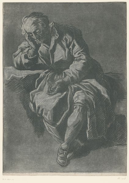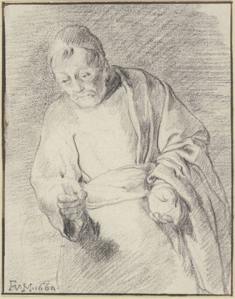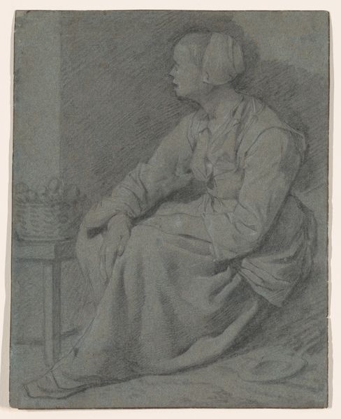 Curator: There’s something so beautifully austere about this work. It's titled "Zittende boerin", or "Seated Farmer Woman," made around 1821 by Johannes Mock, rendered in delicate pencil lines. Editor: My initial impression is…resignation? The lines seem to suggest the weight of years etched onto her face. And the pose, those hands clasped so deliberately, hint at a life spent weathering storms. Curator: Absolutely. I think Mock captures the quiet dignity of his subject with incredible sensitivity. He’s not trying to flatter her or romanticize her life; he’s presenting a very honest portrait. The way the light falls creates a really interesting effect as it almost sculpts her features from shadow. Editor: Yes, her gaze lifted and unfocused suggests a sort of inner monologue. Is it too much to say she's bearing the burdens of her entire community? Perhaps the artist used this raised eye position on purpose to express, symbolically, a silent protest. The headdress seems almost like a uniform, unifying generations of toiling women. Curator: You know, Mock lived through a tumultuous period in Dutch history, seeing massive upheaval in agriculture and rural communities, a period when an enormous portion of farmers fled to urban areas. Knowing this, I wonder if this drawing acts as an homage, even a eulogy, to a disappearing way of life? He memorializes the steadfast presence of this woman as if she's the cornerstone of a disappearing tradition. Editor: And the pencil medium feels particularly appropriate. It gives the work a raw immediacy, almost like a visual transcription of memory. It suggests the impermanence and the preciousness of what he’s trying to record. He has an ability, that cannot be overlooked, to reveal hidden emotional weight of experience that transcends the purely representational function of portraiture. Curator: I find this conversation quite stimulating! It reveals unexpected nuances, turning an ordinary portrait into a thought-provoking statement on the nature of portraiture. Editor: Me too, as now I feel more aware of all those buried layers in this seemingly simple portrait!