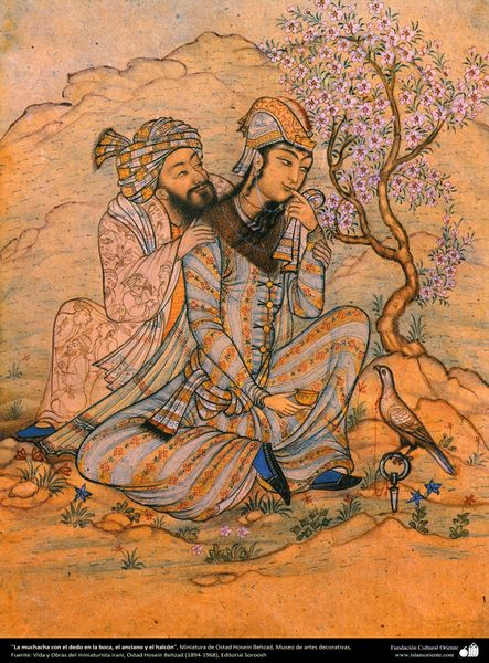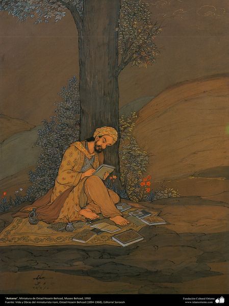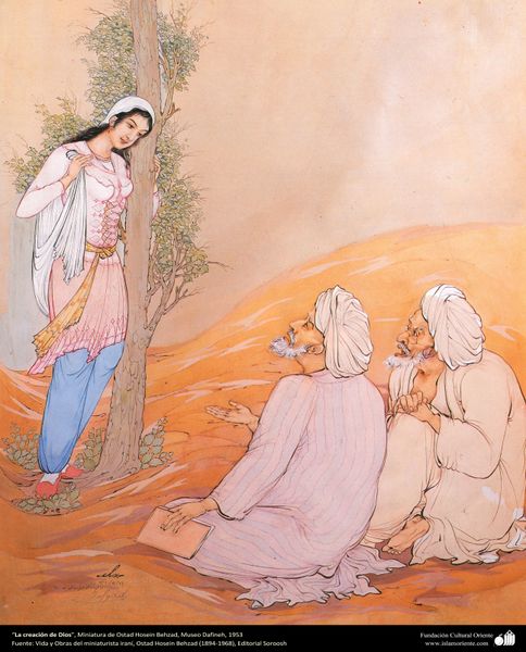 Editor: Here we have Hossein Behzad’s “The Sound of Music,” created in 1961. The rich colors and detail give it a fairytale-like quality. It seems very idyllic. How do you interpret this work? Curator: The artwork invites us to consider the intersection of music, social hierarchy, and leisure in mid-20th century Iran. Observe the attire of the figures and the setting they are placed within: what does this say about social stratification at the time? Editor: I notice the woman is playing music for the man who seems much older than her, lying comfortably. The man's dress looks far more ornate and elegant. Is it suggesting a power imbalance, or perhaps different social roles and expectations? Curator: Exactly. Traditional Persian miniature painting often served as a tool to legitimize the power and privilege of rulers and elites. Given this was created in 1961, can you speculate if Behzad's intention was to reflect tradition or to subvert it in some way? Editor: Perhaps Behzad critiques these traditional social roles by depicting them in a seemingly calm domestic, maybe even challenging the viewers’ own perspective. Curator: Indeed, considering Behzad’s innovative spirit, one could argue he uses this traditional visual language to instigate dialogue about changing societal norms and to critique any imbalance between them. Are we listening closely to what this scene is "saying" beyond just a beautiful aesthetic? Editor: That is really interesting. I will definitely be rethinking my initial assumptions! Curator: It goes to show, placing the artwork within the tapestry of Iranian social context uncovers new dialogues to have about art, history and society!