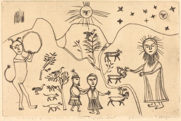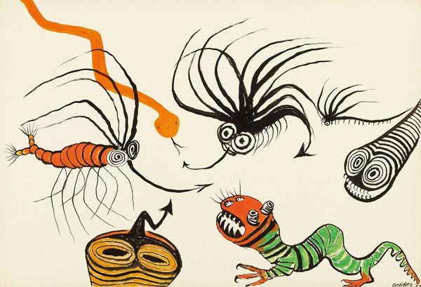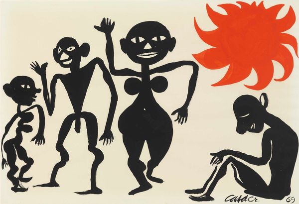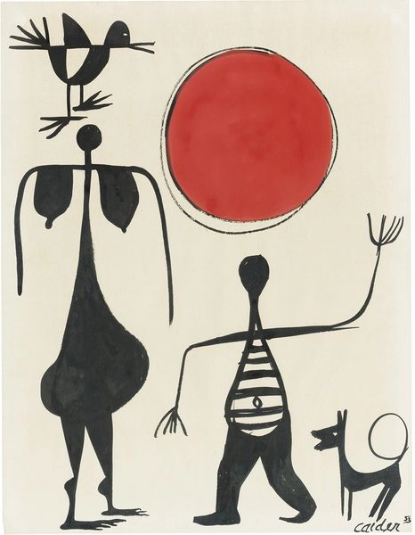 Curator: Immediately, I'm struck by the almost joyful darkness. It's stark, but there's a lightness in the figures' expressions. Editor: Exactly. Let's explore "African Scene," a 1966 ink on paper drawing by Alexander Calder. His playfulness is readily on display, wouldn’t you say? Curator: Absolutely, it’s as if Calder took a detour through a child's imagination, all bold lines and simplified forms. What’s interesting to me is how those blank, eye-like spaces still convey so much feeling. Editor: Yes! And if you delve into it, these stylized silhouettes draw heavily from iconic forms. Look at the sun—a burst of jagged rays. That symbol is potent across cultures and eras, representing life-giving energy. Then, there's the umbrella held by the larger figure. It becomes an emblem of protection, status…maybe even colonial imposition. Curator: That's a delicious tension, isn’t it? This seemingly simple scene hinting at layers of history and power dynamics. And then the figure on the left—he has what appears to be wheels. A toy, perhaps, or something more ritualistic? It's enigmatic. I feel that Calder manages to make the most primitive depiction feel deeply considered. Editor: Precisely, that echo of ritual—we find related figures in everything from Cycladic idols to Picasso's exploration of African masks. Those exaggerated features, particularly in the taller figure, become carriers of cultural memory. Curator: Thinking of it, it has this marvelous confidence to embrace direct, uncomplicated expression, stripping everything back to primal forms and basic symbols, but somehow it lands into the profound, playful storytelling space for me. Editor: Indeed. Calder offers not a definitive statement, but rather an invitation to ponder shared visual heritage and those charged objects we imbue with such meaning.