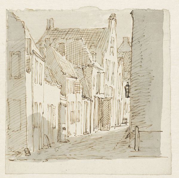 Editor: This is "Keumegas," a print by Harke Johannes Kolk, created sometime between 1885 and 1935 using etching, woodcut, and ink. It’s a narrow street scene, almost claustrophobic, with these towering buildings looming over the viewer. What sort of stories do you think the artist is trying to tell through these stark lines and imposing structures? Curator: Stories aren't always explicitly told; sometimes they are felt through cultural memory embedded in images. Think about the cobbled street, a visual code instantly transporting us to a specific time and place. Doesn't it evoke the sensation of walking through history, each stone whispering tales of those who walked before us? Editor: Definitely. There’s something timeless about that texture. How does the use of black and white contribute to the symbolic meaning? Curator: The stark contrast heightens the emotional impact, pushing certain features forward while leaving other parts to retreat. What emotions arise for you? For instance, observe the vertical lines of the buildings; do they signify growth and aspiration, or do they suggest confinement and the weight of tradition? Perhaps both, existing in a state of visual tension. Editor: That’s a compelling thought. I was so focused on the visual representation I had not considered the possibility of combined symbolism. Curator: Consider the windows – they're not just openings. Windows can be eyes, allowing us glimpses into private lives. Think of the cultural significance of "keeping up appearances," common to any society and era, made possible through that architectural detail. Does it shift how you experience this print? Editor: It really does. I had initially seen it as just a depiction of a street, but now I see how it's laden with meaning. Thank you for revealing all these layers! Curator: It's my pleasure. The real beauty is realizing how much a seemingly simple image can reveal about ourselves and the cultural narrative we inhabit.
