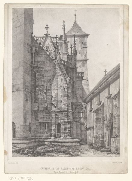 Curator: Let’s turn our attention to “Vrouw knielend voor een kapelletje,” or "Woman kneeling before a chapel," created by Cornelis Springer in 1844. It’s a drawing rendered in ink on paper, currently held here at the Rijksmuseum. Editor: Oh, my. I am immediately struck by the stillness of it all. There's such a palpable sense of reverence emanating from the kneeling figure. It’s also fascinating how the detailed facade of the chapel contrasts with the lively street scene further down the road, complete with a dog. What a strange pairing! Curator: Precisely. Springer masterfully utilizes contrasting textures and details. Note the architectural rendering: The precise hatching delineates every stone, highlighting the solid, almost oppressive structure, whereas the figures in the background possess an open airiness created by quick sketches and lack of detail. We should acknowledge this deliberate spatial organization, which focuses on the structure to emphasize its permanence in a world of impermanence. Editor: Oppressive is such a perfect word here. But isn't that part of its emotional punch? It's so gothic in its starkness, yet there are these very human touches— the old man removing his hat, the bustling figures near the dog... They prevent the scene from turning wholly bleak. Springer created such an interesting mood— not despair exactly, but perhaps... patient longing? It speaks to some raw, primal need for connection. Curator: An astute observation. Springer’s deft manipulation of line weight and spatial arrangements compels a sense of profound introspection. This intersection of Romantic sensibility with nascent Realism results in a unique representation of piety in the context of the ordinary, rendering profound and intricate concepts accessible. Editor: It's like glimpsing a soul laid bare, with the weight of history looming above it all. Now, you mentioned Romanticism mixing with Realism, right? This piece definitely got its hooks in me. There is more here than initially meets the eye, something deeply, disturbingly human, if I might add. Curator: Indeed, that assessment seems fitting. Let's carry this resonance with us as we proceed.