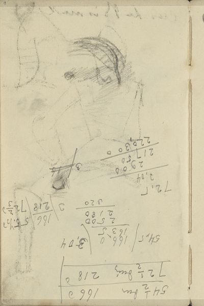 Curator: Here we have a piece called "Tree [verso]" by Robert Hogg Nisbet. It’s an ink drawing on paper, seemingly created with simple, direct lines. What’s your initial reaction? Editor: It’s… intriguing. Stark, almost like a quick diagram. The linework detailing the tree’s form clashes against what looks like mathematical calculations and geometric sketches surrounding the central image. Curator: Yes, it is an unconventional landscape depiction, seemingly composed of what was on hand and present in that very moment. Nisbet probably was utilizing whatever scrap of paper that was there in front of him in that moment. This piece compels one to question traditional artistic boundaries, asking what constitutes art when embedded within the ordinary materials of life. Editor: Absolutely. There's a story here, a tension between nature and culture, represented by the spontaneous rendering of the tree juxtaposed with, equations. What context can we place it within? The note that says “Clarke 1940 full and..." feels key. It seems like these materials aren't coincidental. The context within which these raw materials were used reflects back to what meaning-making the artist, Nisbet was trying to do in that moment. Curator: I agree. Nisbet was using readily available materials for what might have been both intellectual exploration and artistic expression. The intersection reflects the social and the academic converging, using nature as inspiration. Editor: Precisely! It humanizes artistic creation, displaying labor and thought processes behind this composition. Also the inscription "1/4" implies labor in relation to a unit of measure, what is labor if not the making, calculation and the act of doing which Nisbet is revealing right here on this plane of paper? Curator: That reading opens up so many interesting lines of inquiry. The seemingly disconnected calculations now resonate differently, almost like attempts to quantify, control, and understand both the natural and the conceptual world through rational, symbolic manipulation and creation. Editor: It’s this contrast between organic form and these numerical equations that really fascinates me. It's also how it reveals an artmaking through mundane methods that emphasizes identity formation, and the labor that is related with production. It feels relevant even today. Curator: It provides insight into artistic practices as daily living and thinking. Editor: An interesting collision to reveal that every making has a history.