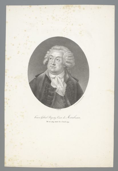 This portrait of Honoré-Gabriel de Riqueti de Mirabeau was made by an anonymous artist using etching and possibly engraving techniques. Looking closely, you can see the fine network of lines that give the image its form and tone. This printmaking process was a highly skilled practice, demanding precision and control over the tools used to carve into the metal plate. The matrix would then be inked and printed onto paper. The very nature of printmaking allowed for the mass production of images, playing a key role in the dissemination of ideas and the formation of public opinion. Considering Mirabeau's prominence during the French Revolution, we can imagine how prints like these would have served to circulate his image and influence. The labor involved in creating the printing matrix, from the artisan who made the paper to the printmakers themselves, speaks to the collaborative nature of the medium. The history of this portrait reminds us that the value and significance of an artwork are as much about the materials, processes, and social contexts as they are about the subject depicted.