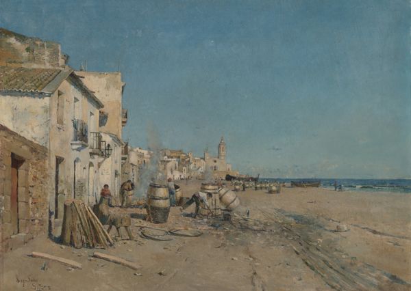 Editor: This is Johann Nepomuk Rauch's "Via Sistina Elmo," a watercolor drawing on paper from sometime between 1841 and 1847. The stormy sea juxtaposed with the buildings makes me think about the power of nature versus human construction. How do you interpret this work, considering the history behind landscape art? Curator: It is crucial to consider Romanticism’s emphasis on the sublime – nature's power to inspire awe and terror. These cityscapes, increasingly popular due to the rise of urban tourism and Romantic sensibility, offered views of controlled chaos; humanity’s precarious existence against the backdrop of untamed nature. Think about what Rauch is showing and not showing - What’s the emphasis here? Editor: Well, the focus is balanced; buildings are prominent, but so is the water and the storm. I see the smallness of the figures that are dominated by buildings or the waves in the ocean. Is this then about showing humanity as secondary? Curator: Precisely. Consider the historical context. This was painted during a period of significant urban growth. By depicting humanity within, or even threatened by nature, artists like Rauch were participating in a wider cultural discussion about the place of individuals, but also industry within this changing world. Also, what feelings are evoked through this display? Is it about beauty or maybe about nature's sublime strength and impact on culture? Editor: The tones do bring feelings of uncertainty due to the storm and rough seas. It seems that Romanticism often involved a sense of something bigger at play than humanity. It makes me wonder how social change at the time impacted how art depicted these relationships between landscape and society. Curator: That's exactly the right thread to pull on. Next time, look into the public reception, think about contemporary views on the impact of industrial development on landscape depictions and discuss your work that way. Editor: I’ve definitely gained a richer perspective now about the conversation the painting encourages and how the public plays an important role within it.