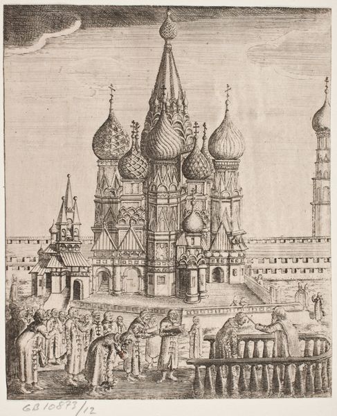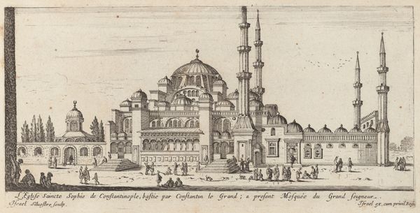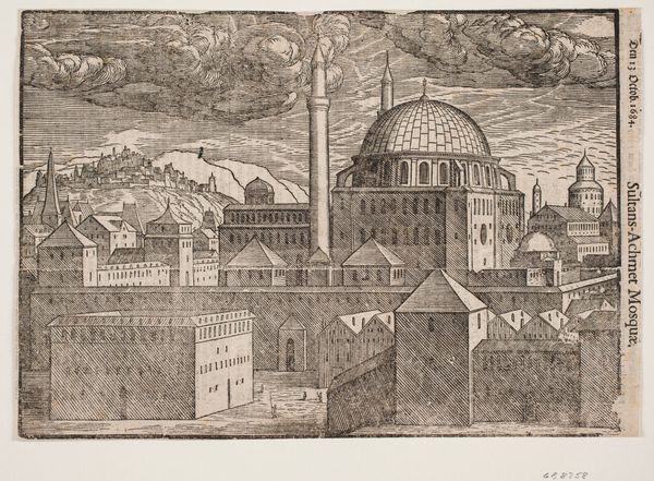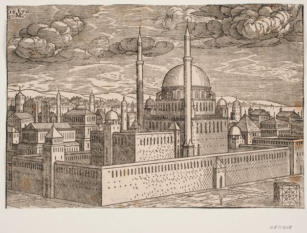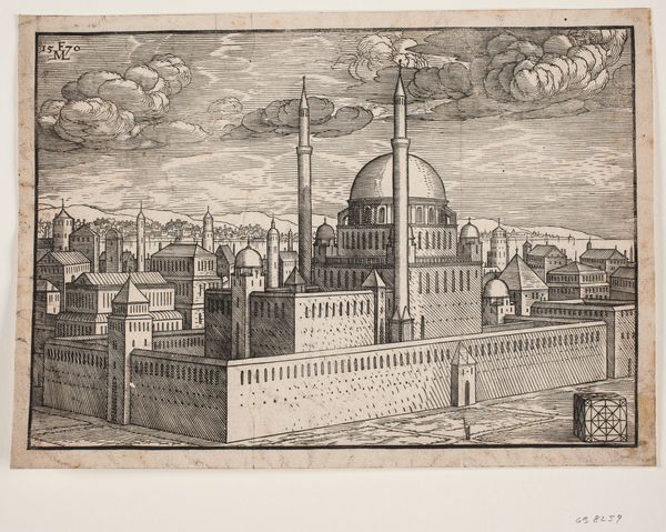 Curator: There’s a striking formality to this rendering of the Bayazidiye Mosque. Editor: It feels surprisingly serene, doesn't it? Despite the intricate detail, the monochrome palette lends it a quiet, almost meditative quality. Curator: Indeed. This etching and woodcut, titled "Idealized image of the Bayazidiye Mosque, seen from South East", was created around 1570 by Melchior Lorck. It’s a fascinating blend of artistic observation and political statement, revealing a European perspective on the Ottoman Empire during a period of significant cultural exchange and tension. Editor: The visual language of power is quite evident. The formidable walls, the symmetrical layout – it speaks volumes about the strength and stability the Ottomans wished to project. I wonder how much Lorck idealized versus how much he truly observed. Curator: That’s precisely the crucial question, isn't it? Lorck was commissioned to document the Ottoman court. He served Emperor Ferdinand I. We see here not only architectural detail, but also how European notions of order and perhaps even a subtle sense of orientalism seeped into the portrayal. Look at the small figures near the base – they are diminutive, perhaps highlighting the perceived distance and difference. Editor: The way the domes recede into the background feels deliberate too. The eye is drawn to the strong lines of the foreground, almost as if the mosque is being framed or perhaps even contained. Was this image intended to inform, or also to subtly reinforce a sense of European dominance? Curator: Likely, both. The symbolic weight of the image resides in its presentation. A European audience may see power but through their own cultural lenses. The meticulous detail would have fuelled both fascination and perhaps a veiled sense of superiority. Editor: It's amazing how a seemingly objective rendering can be so loaded. Seeing it through a contemporary lens, the work encourages questioning of power dynamics and artistic choices. It is clear that what seems documentation contains interpretation. Curator: Yes, a powerful reminder that seeing is never truly neutral; instead, it is layered with socio-political implication. The Mosque's story keeps on giving. Editor: Indeed. Each time we look at it, the conversation seems to expand and deepen.