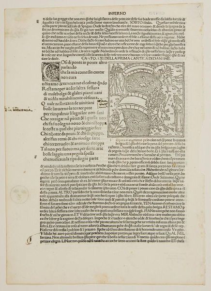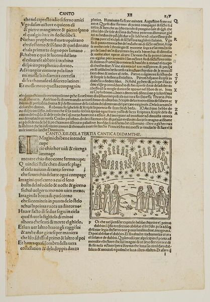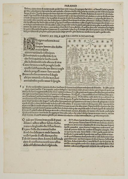 Editor: This page presents Canto VIII from an anonymous edition of Dante's *Paradiso*. The woodcut illustration, with its stars and figures, feels so otherworldly. What do you see in this piece? Curator: Absolutely. We are witnessing a fusion of Christian cosmology and classical mythology. Venus, traditionally associated with love, is here recontextualized within Dante's spiritual journey. Notice how the text subtly critiques earlier "errors," like pagan worship, while simultaneously incorporating classical figures like Cupid. Editor: So, it’s about redefining historical narratives? Curator: Precisely. It invites us to consider how different eras and belief systems intersect and inform each other, challenging any singular, dominant perspective. What does that tension mean for you, as a modern reader? Editor: I see how it pushes us to actively question where ideas originate and how they evolve, even today.