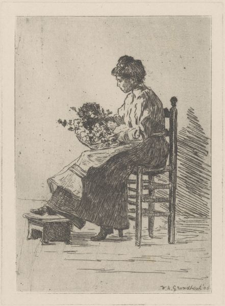 Kornelis de Wijs created this delicate etching, "Meisje bij een waterpomp," capturing a moment of everyday life. An etching such as this involves covering a metal plate with a waxy ground, then drawing through it with a needle to expose the metal. The plate is then immersed in acid, which bites into the exposed lines, creating grooves. Ink is applied, then the surface is wiped clean, leaving ink only in the etched lines. Finally, the plate is pressed onto paper, transferring the image. The medium itself lends a certain character to the work. The finely etched lines create a sense of detail and texture, especially in the girl's dress, and the surrounding foliage. The print captures a slice of life, elevated through skilled labor and artistic representation. By focusing on the labor involved in both the scene depicted and the printmaking process itself, we can appreciate how de Wijs elevates the everyday, blurring the lines between fine art and the skilled crafts.