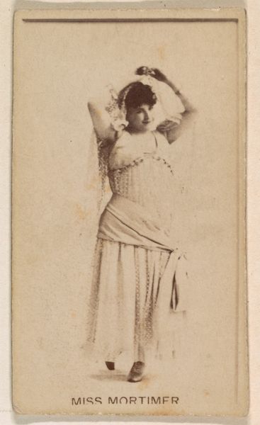 Curator: At first glance, I find myself captivated by the ethereal quality, a visual symphony of light and shadow that dances across the subject’s figure, rendered in delicate, muted tones. Editor: This is "Belle Martin," a photograph from the Actresses series, created by Kinney Brothers circa 1890 to promote their Sweet Caporal Cigarettes. Curator: So, even then, images were tied to commerce. Knowing its intended distribution through cigarette packaging gives context. These weren't high art prints meant for galleries; they were tools of consumerism. Editor: Precisely! This small card tells us a lot about labor, celebrity, and the emergent advertising industry of the late 19th century. Mass production techniques made these cards accessible to the average consumer. It is also an excellent example of intersection of celebrity and tobacco products during this period. Curator: Speaking purely formally, observe the texture of the gown; a frothy sea of ruffles that frame the actress’s shoulders. It draws my attention immediately to the dress itself as if wanting me to appreciate the texture that she has chosen. And the gentle way in which the edges blur lends an almost dreamlike effect. Editor: The choice of photographic printing processes, combined with the limitations of reproduction at that time, certainly played a significant role in its overall appearance. They used albumen prints which are essentially proteins of eggs that were commonly used to make photographic paper in the 19th century and this adds to the tone we see in the artwork today. Curator: Yet, its subtle realism is compelling, the almost tactile sensation of Belle Martin's fabric dress—there's an alluring quality in the subject’s expression that feels deeply captivating despite the format's limitations. The tones really carry emotion. Editor: Absolutely! These "carte de visite" portraits speak to a broader phenomenon— the commodification of beauty and the rise of celebrity culture in the industrial era. Curator: Thank you. Looking at it through your lens gives additional perspective and sheds a light on all that this small photographic piece offers. Editor: Likewise! Analyzing it formally brings the aesthetic achievements of commercial photography into sharper focus.