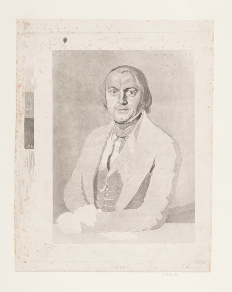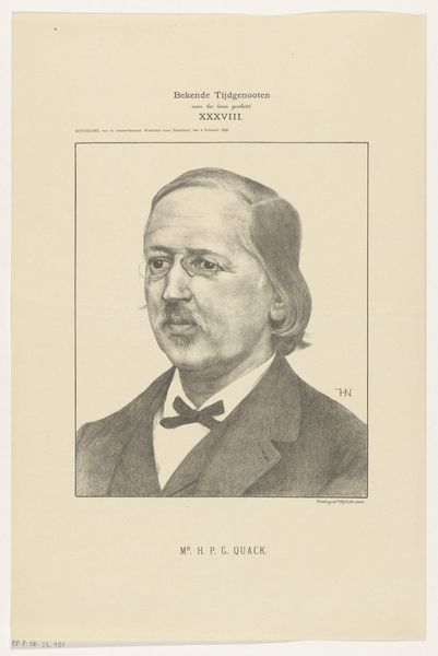 Curator: It's intriguing, isn’t it? This pencil drawing, simply entitled "Portret van Antonie Hendrik Gerrit Paul van den Es," was crafted in 1896 by Jan Veth. It's part of the Rijksmuseum's collection, and a fascinating example of late 19th-century portraiture. Editor: He has such kind eyes, don’t you think? It’s also somewhat severe. The meticulously detailed face emerging from the darkness gives a pensive, contemplative, even a little…stern vibe? It's beautiful, but not in an obvious way. Curator: Right, and what resonates deeply here is how Veth uses the portrait to underscore van den Es’s societal standing. His tailored suit, his neatly groomed whiskers – it all speaks volumes about bourgeois respectability. It mirrors the conservative values and structures prevalent during that era. It's about more than likeness; it's about reinforcing social order through visual representation. Editor: It's interesting that you say that, I wonder though...do you think there’s something subtly subversive happening here? Veth's capturing his serious look and yet, he feels oddly vulnerable. The soft pencil work gives the drawing this dreamlike fragility and almost hints at his own personal stories… a glimpse behind the curtain. Curator: That vulnerability is perhaps precisely the tension that gives the work its power! In looking closely at van den Es’ attire, he still adheres to those established codes of masculine identity, it shows how societal constraints shaped identity representation for men during this era, which limited ways they could express their individual experience and interiority. Editor: Yes! There's the societal expectations, right? and his reality, his actual, maybe melancholic and complicated self. He reminds me of so many men I've known: playing the role expected of them but subtly, desperately wanting to break free, maybe even hoping someone will notice. I think the sensitivity here shows that maybe the artist noticed that, which is touching to see. Curator: Ultimately, in this seemingly straightforward portrait lies an interplay between conformity and individuality. Veth captures the sitter but offers us a broader critique about the era in which it was created. Editor: Absolutely. Looking at it now, I feel like the drawing tells a secret that only paper and graphite can keep. I am strangely moved.