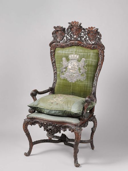 Curator: It's quite something, isn't it? What a statement of power and opulence. Editor: Absolutely imposing. The first thing I notice is how the textures interact—the smooth, plush velvet against the rougher carved wood, and then the glint of the gilded details catching the light. It’s almost overwhelming, really. Curator: This throne is believed to have been used by King Willem II, King Willem III, and Queen Wilhelmina, so dating it is tricky; we think it originated sometime between 1842 and 1898. What truly strikes me is its historical importance, a focal point for national identity. Imagine the proclamations, the audiences…it’s more than a chair, it's a stage. Editor: Yes, the velvet screams status! But it's more than that; look at the lines. There is clear attention to detail. Each curve and embellishment seems deliberately placed to guide the eye upwards, to the crown on the backrest and then to that second crown being held aloft by those heraldic lions. A clever manipulation of verticality. Curator: Precisely! It is a brilliant fusion of Baroque flamboyance and more modern, sober portraiture styles. This throne also reflects shifting political realities, embodying power at a time when the monarchy was negotiating its role in a changing democratic landscape. Editor: Do you think that’s why it looks somewhat conflicted? The weight of those clawed feet, grounded in gold leaf, trying to support such an elaborate statement above? Perhaps it echoes some sort of visual tension... Curator: Perhaps you're right, and to some extent that mirrors the actual tightrope walk of a monarch holding onto authority. The Horrix Brothers studio crafted not merely an object, but a political prop meant to communicate specific messages about leadership and legacy. Editor: Seeing it this way offers a richer understanding, though I maintain it still appears very much like an interesting study in contrasts. Curator: I agree wholeheartedly; looking at this Throne gives unique insights into both art and societal perspective. Editor: I must agree; examining its construction reveals much regarding period values.