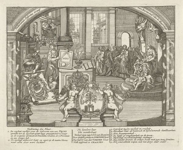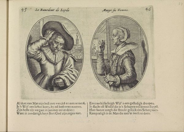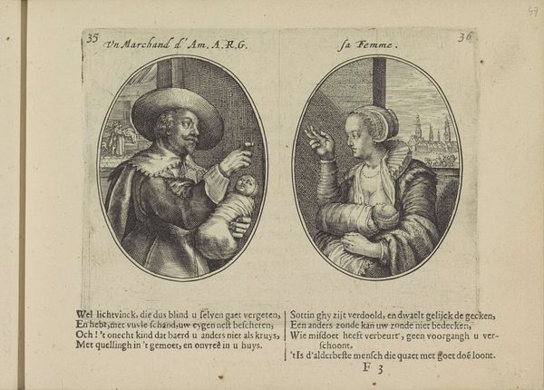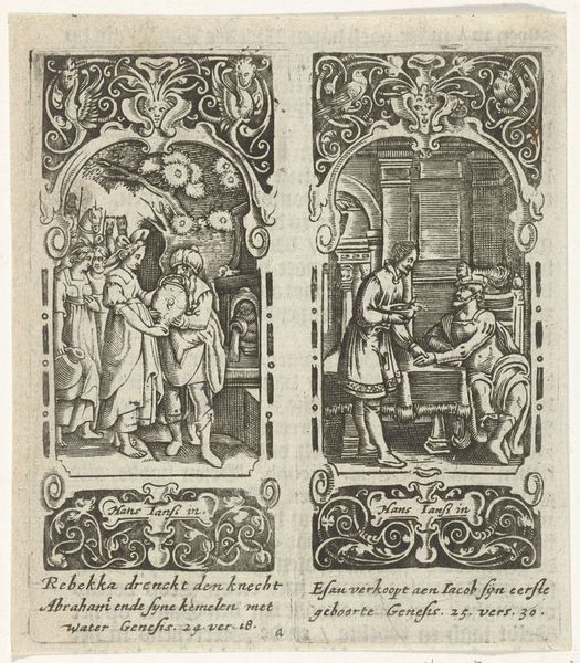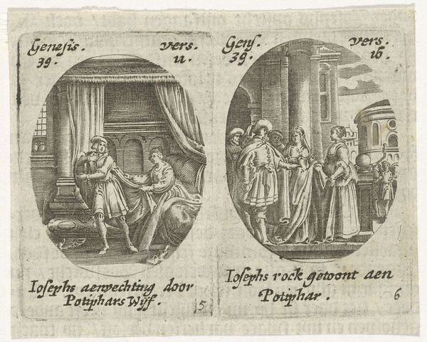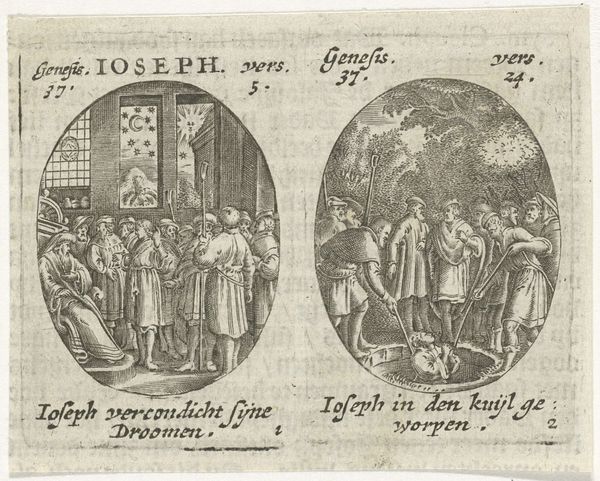 Editor: This is "Joseph Sells Grain to His Brothers / Joseph Interprets Pharaoh's Dream," an engraving dating somewhere between 1615 and 1651, currently housed in the Rijksmuseum. It's fascinating to see two distinct scenes captured together in that distinct oval shape, that sort of diptych-feel, and rendered so meticulously. What do you see in this piece? Curator: As a materialist, my gaze is drawn to the process of production inherent in this engraving. Consider the socio-economic context: the paper, ink, and the artisan’s labor—these materials reflect a specific market. Note the contrast in the depiction of labour: on one side the toil of grain distribution and on the other, Joseph interpreting the dream before Pharaoh. What does that juxtaposition tell you? Editor: That the act of labor is a core point in understanding it. I notice how class and status dictates involvement: Joseph's elevated role means he is not physically toiling, while others are burdened by their economic circumstance. Curator: Precisely. The choice of engraving, a relatively reproducible medium, suggests wider accessibility and consumption. This connects to the themes: famine, resource management, and ultimately, power dynamics rooted in material needs. Are we looking at a religious interpretation, or perhaps social commentary about resource distribution? Editor: So, by looking at the "how" and "what" of the material, we gain a deeper insight into the societal values of the time, highlighting that perhaps there is a focus on the societal need for physical things which drove class. Curator: Exactly. By examining the materials and production process, we uncover layers of social and economic meaning embedded within the artwork. Editor: This approach really opens my eyes to art beyond just what is depicted, it can also showcase production circumstances and material relevance!