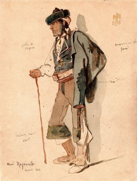 Curator: This is Charles M. Russell’s Self Portrait [No. 4], created in 1900 using watercolor and charcoal. It offers a captivating glimpse into the artist's self-perception. Editor: Wow, right off the bat, there's a quiet swagger here. He's leaning back, almost like he's assessing the viewer while coolly taking it all in. You sense there is so much being held back and he knows it. Curator: Indeed! What fascinates me is how Russell, immersed in depicting the West, chooses to present himself here. He's not overtly ‘cowboy,’ but a gentrified version, albeit with that unmistakable sash suggesting a lived experience on the frontier. How might that portrayal play into shaping his persona as an artist? Editor: That sash definitely reads as a claim to authenticity, almost like a prop but it's too close to be called that. There’s this interesting tension. He’s clearly cultivating an image, softening the cowboy stereotype but leaning into the romanticism associated with it. Is it about selling a narrative, solidifying his artistic brand at the turn of the century? Curator: Possibly, but maybe there’s also a sincere negotiation happening. He understands his market, catering to Eastern tastes perhaps. But he clearly knows what image of him as someone intimate with a West romanticized can gain. The slight upturn of the lips reads as both sincere, but cunning at the same time. Editor: True. This is right at the peak of the Western genre, think of Frederic Remington. It must've been tempting, maybe even necessary, to partake to an extent in creating your own image in this expanding economy. He needs to get himself out there, to play the cowboy artist, if that makes sense? But without completely shedding who he truly is as a person, of course. Curator: What strikes me, too, is the medium, right? He doesn't opt for the grandeur of oil paints, but a humble watercolor—implying modesty or something else? Maybe watercolors suggest authenticity more readily, something raw or personal. It's more honest, down to earth, more rugged to create as he wishes. What a play! Editor: That's such a keen observation! The use of watercolor subtly undercuts any pretension. It adds to that feeling of an unfiltered perspective and, because watercolors tend to flow more loosely, more uncontrolled than something like oil, gives off the feeling this truly represents something special and intimate. It almost feels like this gives him an element of control about what people feel or take away. What a legacy to make! Curator: Well said, as an exploration of identity and artistic branding, Russell’s self-portrait remains a study in complexity! It shows the artistic thought, what others should take, but at the core, keeps the viewers thinking and wanting more!
