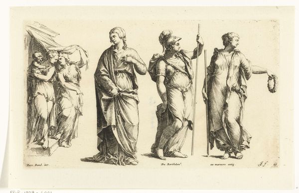 Editor: This is "Drie staande mannen" by Jan de Bisschop, created between 1668 and 1671. It's currently housed in the Rijksmuseum. The piece looks like an ink drawing of three standing men, but what strikes me is the different approaches to rendering their robes. How do you interpret this work, and its different artistic approaches to clothing? Curator: It's compelling to consider de Bisschop's work through the lens of materials and production. Notice the varying line weights achieved through what appear to be pen and ink. The labor invested in each figure suggests an exploration of different drawing techniques, almost like studies. We can also think about the consumption of artistic knowledge here – are these copied from other artworks, intended for instructional use themselves, or purely experiments with materiality? Editor: So you are saying that the variations in technique might be more about the 'how' than the 'who' being depicted? Curator: Precisely. Rather than focusing solely on the identities of these figures, consider the act of making itself. How does the artist's process – his choices of ink, pen, paper, the application of line – contribute to the overall meaning? Are the robes depicted, perhaps commentary of what and how individuals can materially present themselves in society? This focus on the means of production and the materials involved pushes us beyond traditional art historical questions of iconography and attribution. Editor: That’s a really interesting way of looking at it. It's like each figure is an exercise in exploring different material capabilities. Curator: Exactly! And in doing so, de Bisschop elevates the role of craft and technique to the forefront, challenging us to think critically about what constitutes "high art." Editor: I never considered looking at a drawing this way, but thinking about the physical process and materials used definitely sheds new light on it. Thank you! Curator: My pleasure. Considering the materiality of art often reveals hidden layers of meaning.