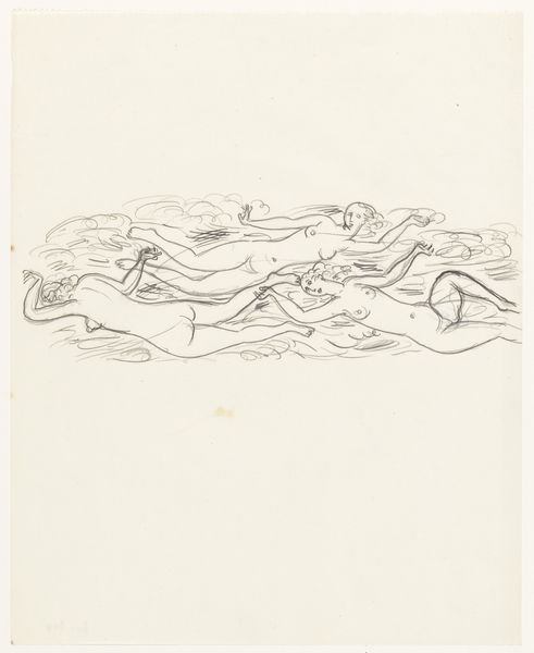 Editor: Take a peek at Edvard Munch’s "Omega’s Flight," a lithograph from around 1908, currently at the Art Institute of Chicago. I'm really struck by how raw and immediate it feels, given it’s a print. What can you tell me about it? Curator: I'm immediately drawn to the artist's use of lithography to engage with the concepts of labor and artistic production. Notice the way Munch has deployed line and shadow. How does the application of graphite serve to underscore the socio-economic circumstances informing artistic output, and is Munch maybe reflecting on the commodification of leisure? Editor: That’s an interesting point; I hadn’t really considered it in terms of commodification, more about... solitude. What specifically about the lines and shadows brings the labor aspect to mind for you? Curator: The frenetic lines of the water, rendered with an etching technique that suggests immense effort, contrasted with the relatively simple rendering of the nude figures. Doesn't it subtly undermine traditional hierarchies of art – figure versus landscape, drawing versus more 'finished' forms? How might the 'finish' point towards consumption, production, the market and exchange itself? Editor: I can see how you'd make that connection now, comparing the labor invested in creating the scene versus the… I suppose, the figure is also ‘produced,’ a result of labour too? The juxtaposition implies commentary on the differing values society assigns? Curator: Precisely. Consider, too, the accessibility of printmaking, of art, as challenging elitist norms. Editor: That makes me rethink my initial impression quite a bit. Seeing the ‘accessibility’ offered by printmaking. Curator: Munch's artistic choices highlight the intricate connection between production and the art market, something often obscured when looking only at ‘high art.’