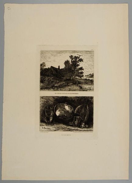 Curator: My first thought is that this is a little dark, even unsettling. It looks like a fairy tale gone wrong. Editor: This is Alfred Henri Darjou's "The Avenging Rabbits" from the collection of the Harvard Art Museums. It presents a curious scene, doesn't it? Look closely at the interplay between predator and prey here. Curator: Absolutely! The limp fox surrounded by alert rabbits really flips the script on who's in charge. Is it humor, or is it social commentary? Editor: I think it's both. There's definitely a critique of power dynamics here, perhaps reflecting on class struggles through an unexpected lens. The rabbits' coordinated action speaks to the power of collective resistance. Curator: And the medium itself—printmaking—makes me think about reproducibility and how messages can be disseminated widely. It's like an early form of viral meme! Editor: I see that too, the way Darjou uses this accessible medium makes this radical reversal all the more provocative. He's not just depicting a scene; he's making a statement. Curator: It's a powerful reminder that even the smallest among us can band together to challenge the status quo. I love how it makes you question your assumptions. Editor: Indeed, it leaves one thinking about power, vulnerability, and the surprising ways narratives can be overturned. An artwork that lingers long after viewing.