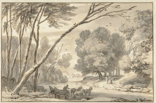 This landscape, made with pen in brown ink and brush in gray ink by Abraham Teerlink, invites us to consider the craft of capturing a scene. Teerlink's choice of materials—pen and ink—is itself a statement. These are the tools of sketching, of immediate impressions, not the more elaborate techniques of finished painting. Look closely, and you'll see how the fluidity of ink allows for quick, expressive lines, defining form and shadow with economical strokes. The landscape genre had become popular, and Teerlink engages with it here. However, the image also draws on another tradition, that of the artist's workshop. We see a draftsman at work, observed by figures who seem to be discussing the scene. Perhaps Teerlink is making a comment on the labor of art.