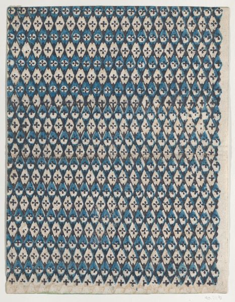 Editor: This is an intriguing book cover, made sometime in the 1700s by an anonymous artist. It’s a print, perhaps meant to resemble textile. The blue and floral pattern gives me a feeling of serene regularity. What elements of composition do you find most compelling here? Curator: The visual interest lies primarily in the orchestration of the pattern itself. Observe how the horizontal lines provide a grounding structure, a grid if you will, against which the floral motifs are deployed. Notice the restricted palette; the chromatic interaction between the blue ground and the warmer tones of the floral elements is critical. Editor: Yes, I see that now! It almost vibrates visually. What’s the effect of that repetition? Curator: The repetition reinforces a sense of order but is cleverly subverted by slight variations within each floral unit. This prevents the pattern from becoming monotonous and encourages a closer, more sustained viewing. One must ask what it signifies for design. Editor: Signifies? As in meaning? Is there a symbolic structure to this textile pattern? Curator: While the symbolism might be debated, its function as visual structure within the design is undeniable. We are encouraged to observe this function in terms of structure. Do you find a layering? Editor: Well, now that you point it out, yes! The layered effect is so interesting because it creates depth without relying on traditional perspective. It's quite flat but not at all boring. Curator: Precisely. The absence of depth cues forces our eye to engage with the surface and appreciate the intricate dance of line and color. The drawing itself then becomes a subject in focus, distinct from the intention of its creation. Editor: That's such a shift in perspective for me. I was initially drawn in by the cover as a whole. But the beauty really lies in the way each formal element relates to the others, creating its distinct impact. Curator: Indeed. That interplay of the drawing and forms helps constitute a design. Close looking allows these relations to come forth, shifting it all into a more comprehensive impression of an aesthetic design, with parts reliant on each other for greater cohesion.