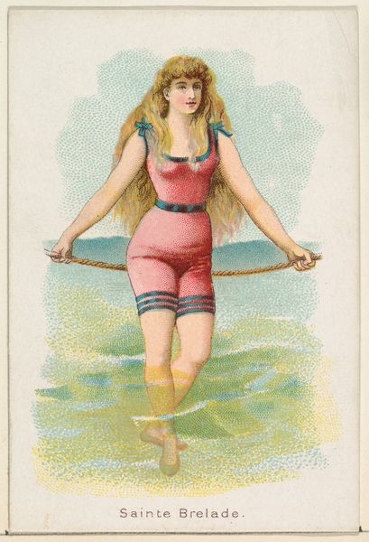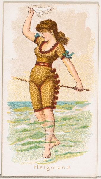 Curator: Here we have "Helgoland, from the Beautiful Bathers series," a print from 1889 by Wm. S. Kimball & Co., currently residing at The Metropolitan Museum of Art. Editor: Wow, a very Victorian-era seaside daydream! She looks a little precarious, balanced on what seems like the edge of reality and holding that somewhat soggy-looking towel aloft. Almost as if she has summoned a cloud right from the heavens. Curator: Indeed. These were originally issued as trade cards within cigarette packets. Mass-produced, affordable little glimpses into popular ideals of beauty and leisure. Editor: Trade cards, how quaint! Though, to our eyes today, this "bathing suit" feels rather, well, not very conducive to actual swimming! I'd rather keep all my dresses. Still, I get a sense of gentle daring, perhaps a playful commentary on propriety? All those frills are rather amusing when applied to swim apparel. Curator: Precisely! It plays into the societal obsession of portraying ideal femininity—while, naturally, serving a commercial interest for the tobacco company that distributed these to the masses. These types of series provided visual narratives for consumer engagement in their own realities, shaped as promotional ephemera of beauty standards and societal roles. The impressionistic water color helps to bring out this genre painting with this portrait styled card. Editor: A strange, but maybe not too unfamiliar blend of exploitation and whimsy, I suppose! She might just be a bit empowered at a personal level; look, the colors and composition feels optimistic to me. Is this perhaps a sly celebration of female self-discovery disguised as mere eye-candy? Or at the very least, an expression of the individual versus society? Curator: That's quite plausible, actually. What remains is a striking snapshot into a historical visual culture shaped by evolving commercial, gendered, and social forces. Editor: It does spark such interesting conversations; thank you. Curator: The pleasure was mine, I really appreciated your view.