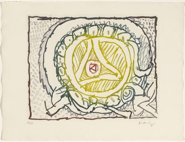Curator: This intriguing linocut print, "Stars and Disasters," was created in 1969 by Pierre Alechinsky. You can see the bold lines typical of his work and his interest in exploring themes related to abstraction through printmaking. Editor: Wow, it vibrates! Like a psychedelic petri dish, or maybe a quirky weather map. The rainbow hues are so inviting but then, "disasters"? Now I’m seeing the wobbly, almost frenetic linework and the crude circles more as…portentous. Curator: The title offers a powerful juxtaposition, doesn't it? Alechinsky, associated with Art Informel, often played with contrasting elements. I'm particularly drawn to the visible labor here. You can see the texture imparted by the linoleum block, almost feeling the artist’s hand at work. The act of carving, printing, repeating—it's all part of the statement. Editor: Absolutely. The hand of the artist really makes you consider how this organic pattern was shaped by that tension of control and happenstance. Did he plan that slight rainbow gradient from red out to green at the very center? The little gestures within those circles - the little markings give everything this raw and exciting feeling. Curator: Exactly. And consider how the "disasters" might relate to broader cultural anxieties of the late 60s. Alechinsky was engaging with post-war concerns, anxieties around technology, the potential for destruction. This piece offers, I believe, a response. Editor: I can see that, even just in the immediacy of the Pop Art influence! Thinking about print as a medium, meant for repeated reproduction - and then contrasting that accessibility and democratized medium with this expression of such intimate and unique gesture? Curator: Precisely. That contrast—between mass production techniques and unique artistic expression—is key to understanding Alechinsky's social critique. It brings a tension to this piece that speaks of broader forces than stars and disasters. Editor: Well, I’m thoroughly unsettled, in the best possible way! So much more than a colourful circle. Curator: Indeed, Alechinsky pulls us into a space of beautiful unease.