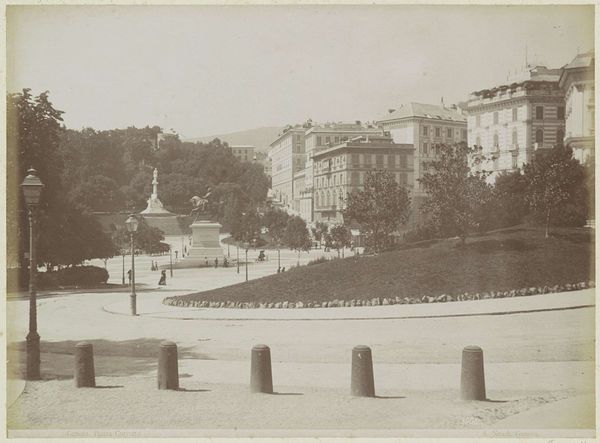 Editor: This gelatin silver print from Alfredo Noack, sometime between 1870 and 1900, depicts the Piazza Corvetto in Genoa. The composition feels quite formal, dominated by the statue. What's striking to you about this piece? Curator: I’m drawn to the image's capacity to document the means of urban production. The gelatin silver process itself is key. Its relative affordability and reproducibility expanded photographic practices. But consider the urban space: how was it planned and built? What labour went into constructing those neoclassical buildings and the monument itself? What was the consumption like, around the Piazza? Editor: So you see the photograph less as art, and more as a record of urban development and labor? Curator: Precisely! Think about the materials themselves. Gelatin silver requires specific ingredients and processes. The photographic paper, the chemical solutions, the glass plate negatives – these were products of industrial capitalism. We must also ask, who is this photograph FOR? Was it to generate tourism? The commercial value changes its intention entirely. Editor: That's a fascinating point. I hadn't considered how the commodification of the image affects its meaning. Curator: The small figures dotted across the piazza become like accessories for the urban and monarchial glorification, captured with newly inexpensive means, widely distributed as postcards. Editor: This image made me appreciate that art isn't created in a vacuum; it is related to how people live, and even its manufacture. Curator: Yes, a full embrace of the art’s complex relationships.