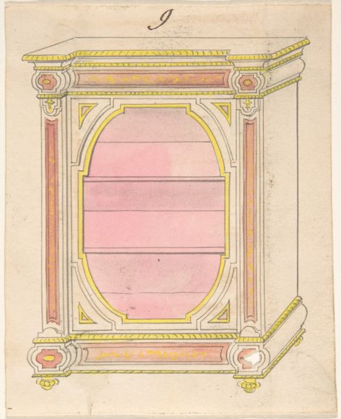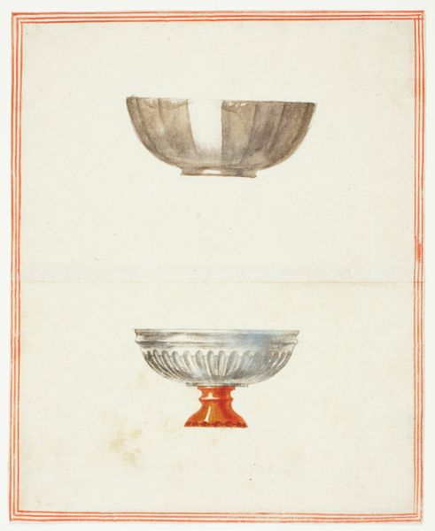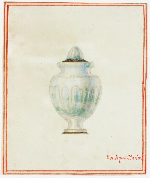 Curator: Standing before us is "Ex Egiata," a drawing attributed to Giuseppe Grisoni. Executed in chalk, gouache, colored pencil, and watercolor on paper, this work is currently held here at The Art Institute of Chicago. Editor: It strikes me immediately as ethereal. The pastel shades, the almost weightless quality of the bowl itself—it feels like a captured dream. Is that delicate red border original? Curator: The border definitely echoes a classical frame. This work comes from a time deeply engaged with classical forms and mythology. Even without figures, it evokes a certain narrative grandeur, don't you think? The bowl is placed at eye-level and presented like a sacred object or fragment that survived time. Editor: Absolutely. Notice how Grisoni manipulates light. The subtle gradations of blue and green suggest depth, and the almost hazy edges give it a luminous quality. However, there's a slight tension in the rendering; that bronze support, while ornate, feels almost too heavy, like a grounding element against the bowl's airy form. Curator: I agree. I think Grisoni is contrasting earthly permanence with the ephemeral quality of beauty or perhaps even memory. A bowl suggests utility, domestic life—but this one transcends that, doesn't it? Also the term “Ex Egiata” written on the right evokes for me an extraction, or coming ‘out of Egypt’. This takes us straight into thinking about ancient civilizations and treasures taken as spoils of conquest. Editor: So you’re thinking about appropriation? Curator: Yes, definitely! As for how it was achieved, note the visible strokes and the layering of different colors; chalk, gouache, watercolour, pencil: the blending suggests painstaking process with many subtle alterations. Also, note how little color there is elsewhere! Editor: A point well-taken. Curator: It’s a reminder of art's power to transform everyday objects into symbols laden with historical weight, I think. Editor: And for me, it reaffirms how close visual examination reveals subtle, deliberate choices that contribute to an artwork’s unique presence. The eye doesn't know where to rest! Curator: Quite so. Thanks to the blending between a more traditional European art and an idealized representation of relics or archaeological memory that remains evocative.