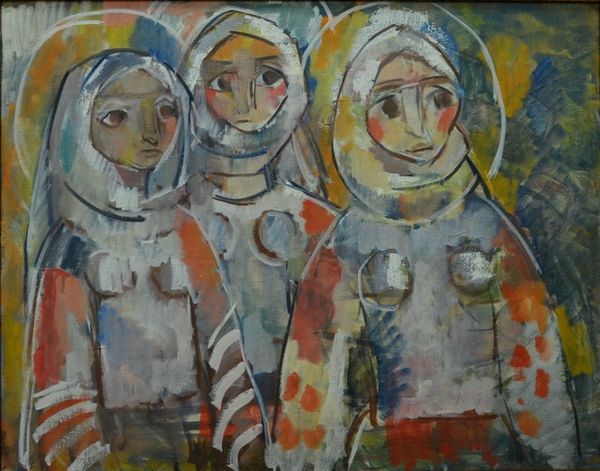"Four Women and a Cat" is a painting by Mykhailo Boychuk, but the exact date it was made is unknown. This piece reflects Boychuk's commitment to a distinctly Ukrainian modernism, one rooted in folk art and Byzantine traditions. The stylized figures, bold colors, and simplified forms evoke early Christian frescoes and traditional Ukrainian iconography. Created during a period of intense cultural and political upheaval in Ukraine, which was then part of the Soviet Union, it is difficult to precisely place the work in time, but its themes of identity, community, and cultural heritage seem especially resonant. Boychuk sought to create an accessible art that spoke to the experiences and aspirations of the Ukrainian people. His efforts to cultivate a national artistic identity ultimately clashed with the Soviet regime's agenda of cultural homogenization and internationalism, however. Boychuk was executed in 1937, and his work was suppressed for decades. To fully understand this painting, we must consider the history of Soviet repression and Ukrainian resistance, consulting archives, historical documents, and critical texts to illuminate the complex relationship between art, politics, and national identity.